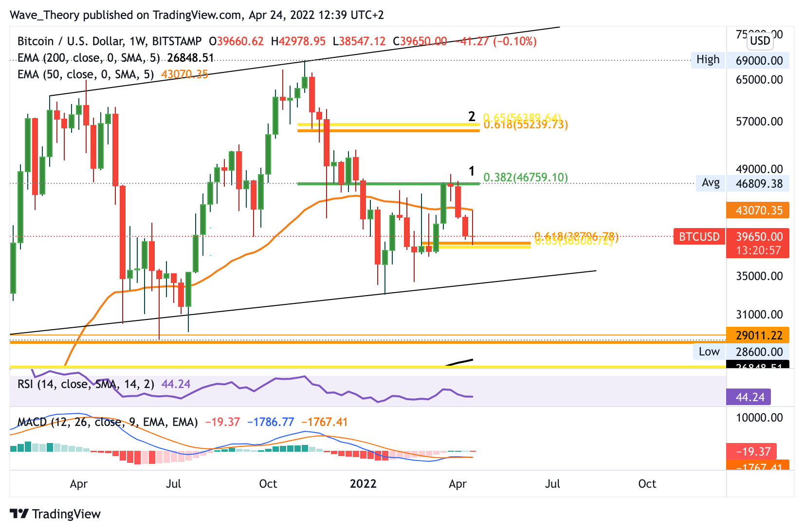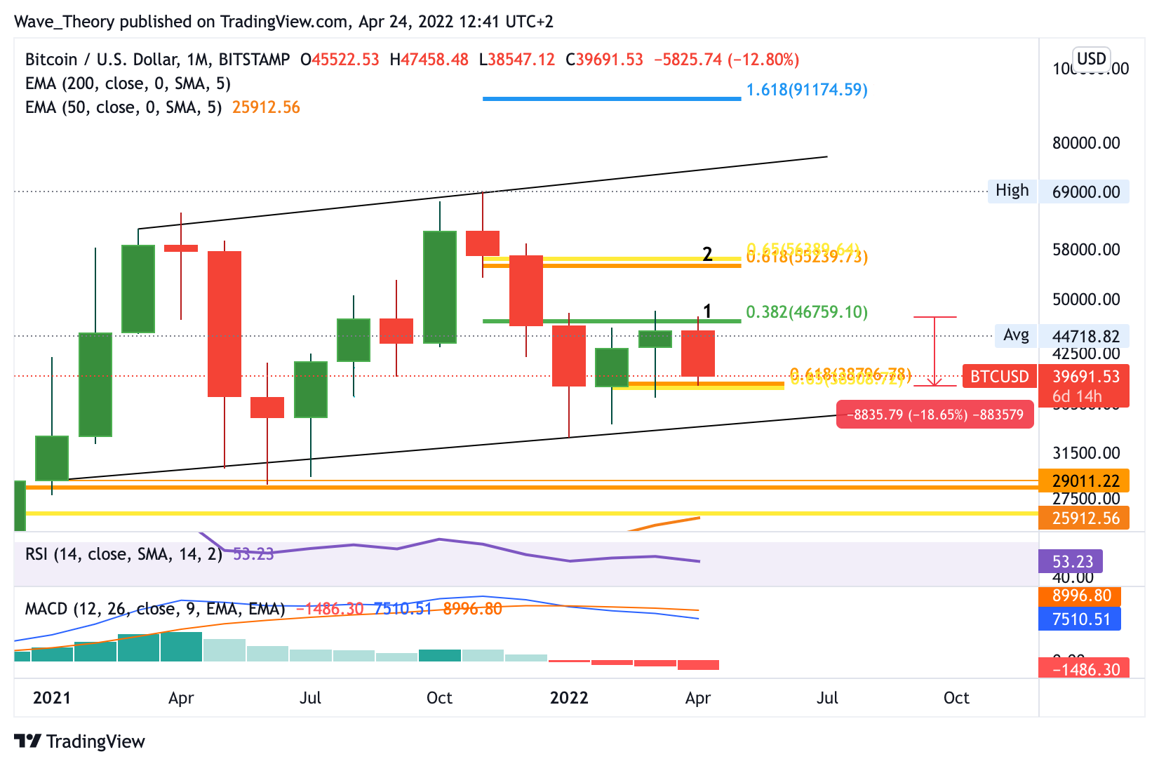 Insgesamt verläuft der April alles andere als bullisch für den BTC Kurs. Rund 20 % stürzte der BTC Kurs in diesem Monat ab und sollte er durch die Golden Ratio Unterstützung bei rund 39.000 USD fallen, könnte er sogar zur Unterstützung zwischen 25.900 – 29.000 USD zurückkehren. Davor findet er aber noch kleinere Unterstützung an der Trendlinie bei rund 35.000 USD. Auch der MACD zeigt sich im Monatschart unverändert bärisch, denn das Histogramm tickt weiterhin bärisch tiefer während die MACD Linien bärisch überkreuzt bleiben.