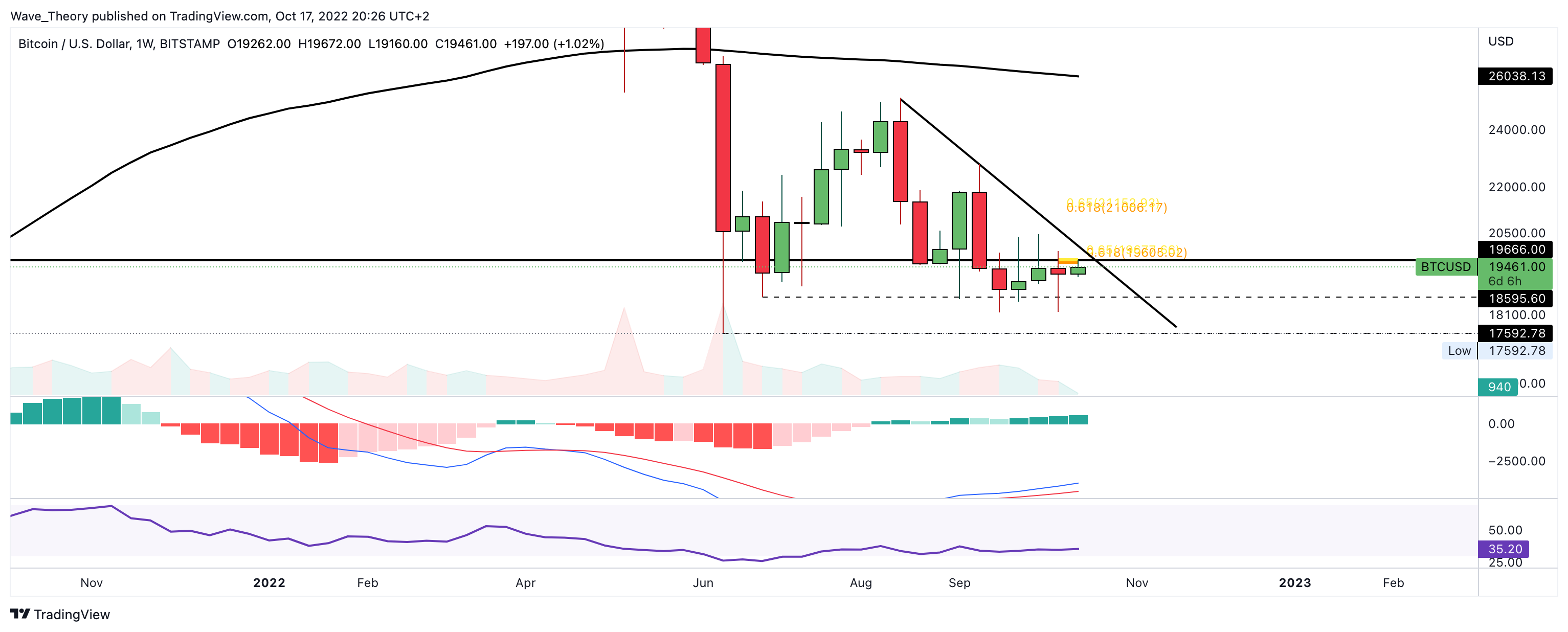 Im Wochenchart zeigt sich der MACD weiterhin bullisch. So tickt das Histogramm nun die vierte Woche in Folge bullisch höher und auch die MACD Linien sind noch bullisch überkreuzt. Ein Bruch der Golden Ratio bei rund 19.650 USD würde definitiv ein Anstieg auf rund 21.000 USD nahelegen.