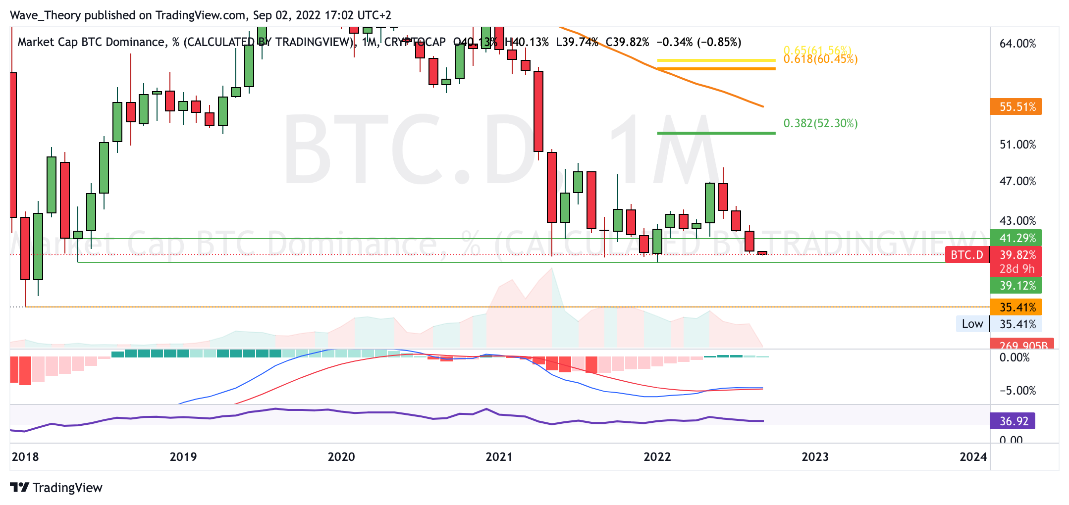 Insgesamt scheint die Bitcoin Dominanz aber zu schwächeln und hinsichtlich des Ethereum Merges gibt es bereits erste Spekulationen, dass Ethereum den Marktanteil an sich reißen könnte. Sollte Bitcoin wirklich auf 35,4 % fallen, hätte Bitcoin damit den absoluten Tiefpunkt erreicht; das ATL (all-time-low).