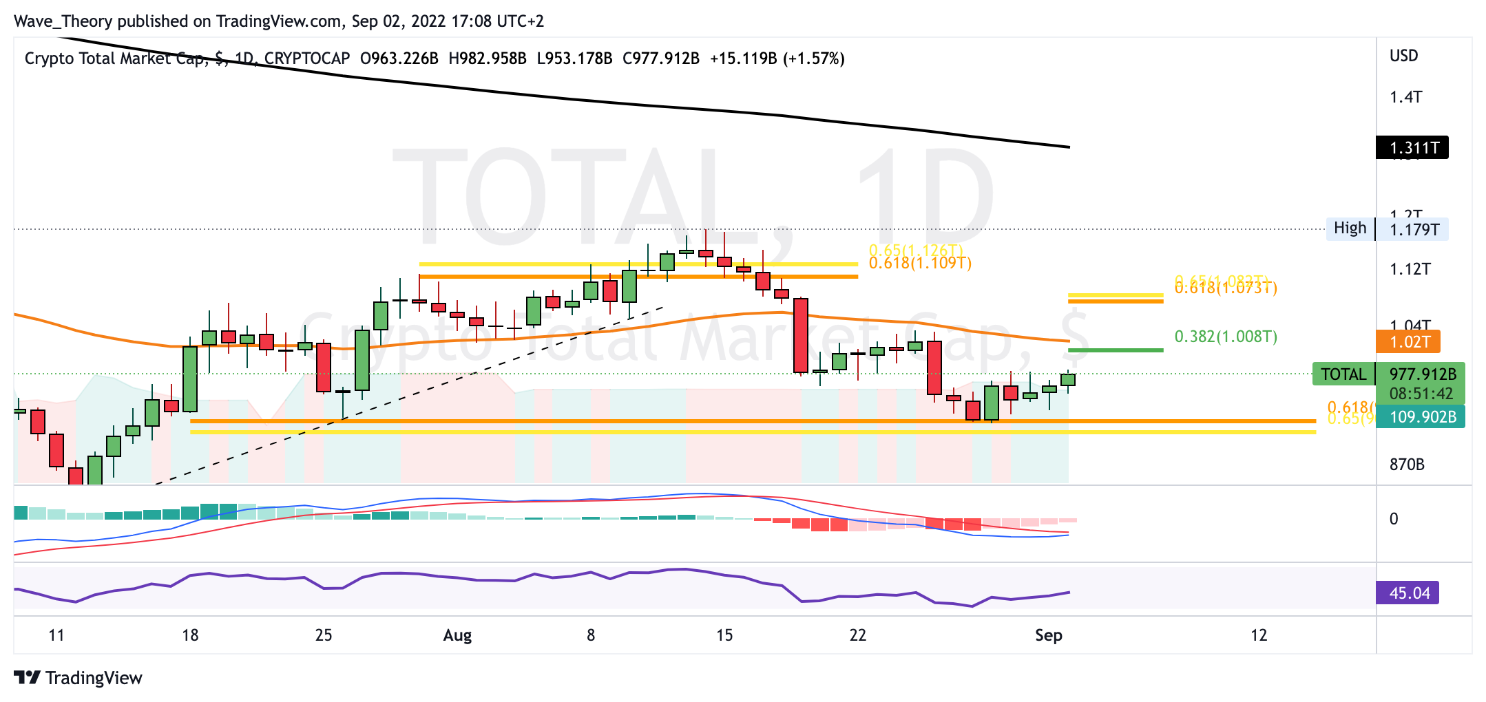 Die Korrektur ist dann beendet, wenn die Marktkapitalisierung von Krypto rund 1,08 Billionen USD übersteigt. Dann könnte der Kryptomarkt erneut den Versuch unternehmen, den letzten Hochpunkt bei rund 1,18 Billionen USD zu übertreffen, um zum 200-Tage-EMA bei rund 1,31 Billionen USD zu steigen.