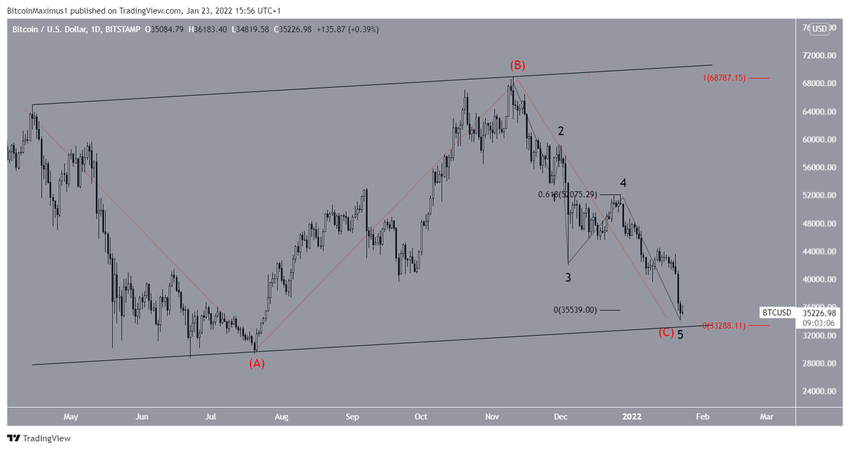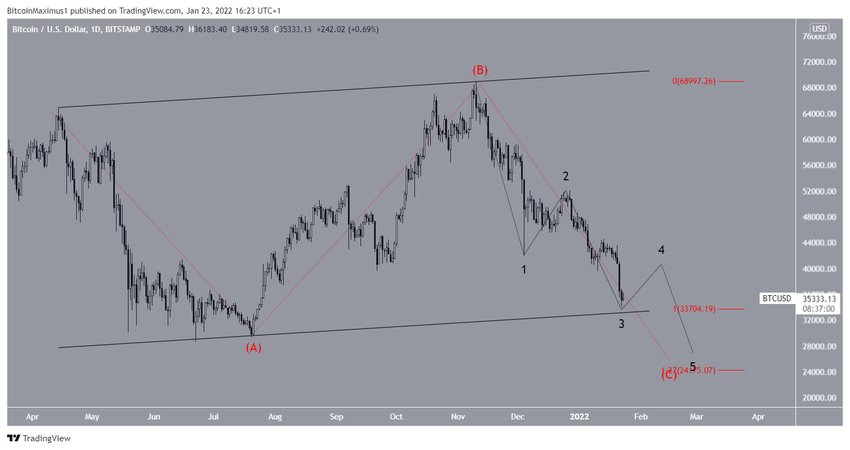 In dem Chart des Tweets kannst du ein reguläres Flat-Correction-Pattern sehen. Der Bitcoin Kurs wäre in diesem Fall in der C-Welle des Patterns. Dabei würde die Korrektur bei dem Support-Level bei 33.300 USD enden. Die A und die C Welle hätten dann ein 1:1-Verhältnis (Rot). Außerdem befindet sich dort die Support-Linie des Parallelkanals, indem der BTC Kurs seit April 2021 gehandelt wird.
