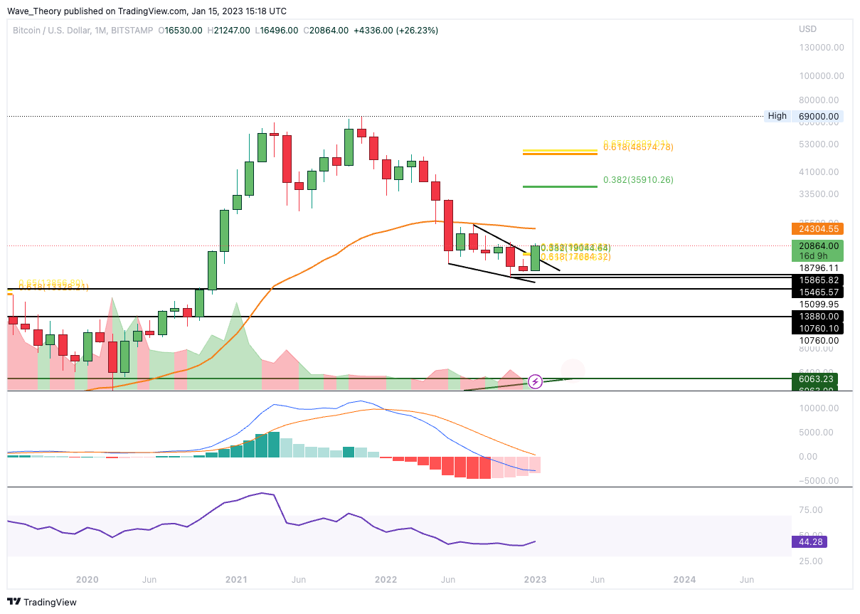 Der Bitcoin Kurs konnte bereits rund 37,3 % steigen, seit der BTC Preis den Tiefpunkt in diesem Zyklus bei rund 15.480 USD erreicht hatte. Dabei konnte BTC auch den Golden Ratio Widerstand bei rund 19.250 USD brechen und bullisch aus dem Falling Wedge Kursmuster ausbrechen.