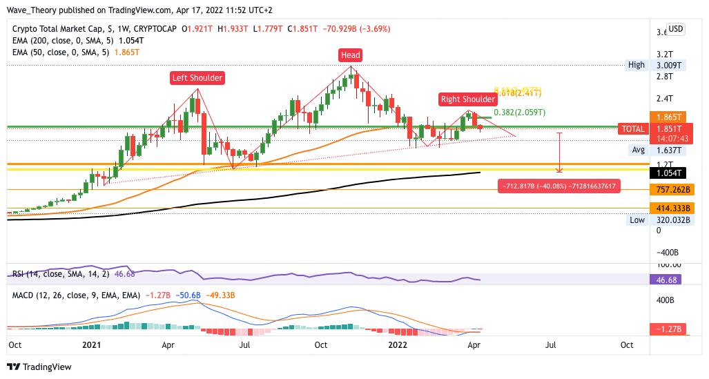 Auch im Chart der Marktkapitalisierung des gesamten Kryptomarktes, welcher durch Coinmarketcap erfasst wird, konnte der Kryptomarkt nicht bullisch ausbrechen. Stattdessen wurde sein Trend bärisch bestätigt, denn auch hier erfolgte eine bärische Ablehnung am 0,382 Fib Niveau, womit sich ein tieferer Hochpunkt formte. Zudem befindet sich der Kryptomarkt in einem bärischen “Head and Shoulders” Muster, womit der Kryptomarkt, bei einem bärischen Ausbruch, rund 40 % korrigieren könnte, um anschließend zwischen dem 200-Wochen-EMA und der Golden Ratio starke Unterstützung zu finden. Zwischen 1 B USD und 1,2 B USD erwartet den Kryptomarkt also sehr starke Unterstützung, an der er sehr stark abprallen könnte.