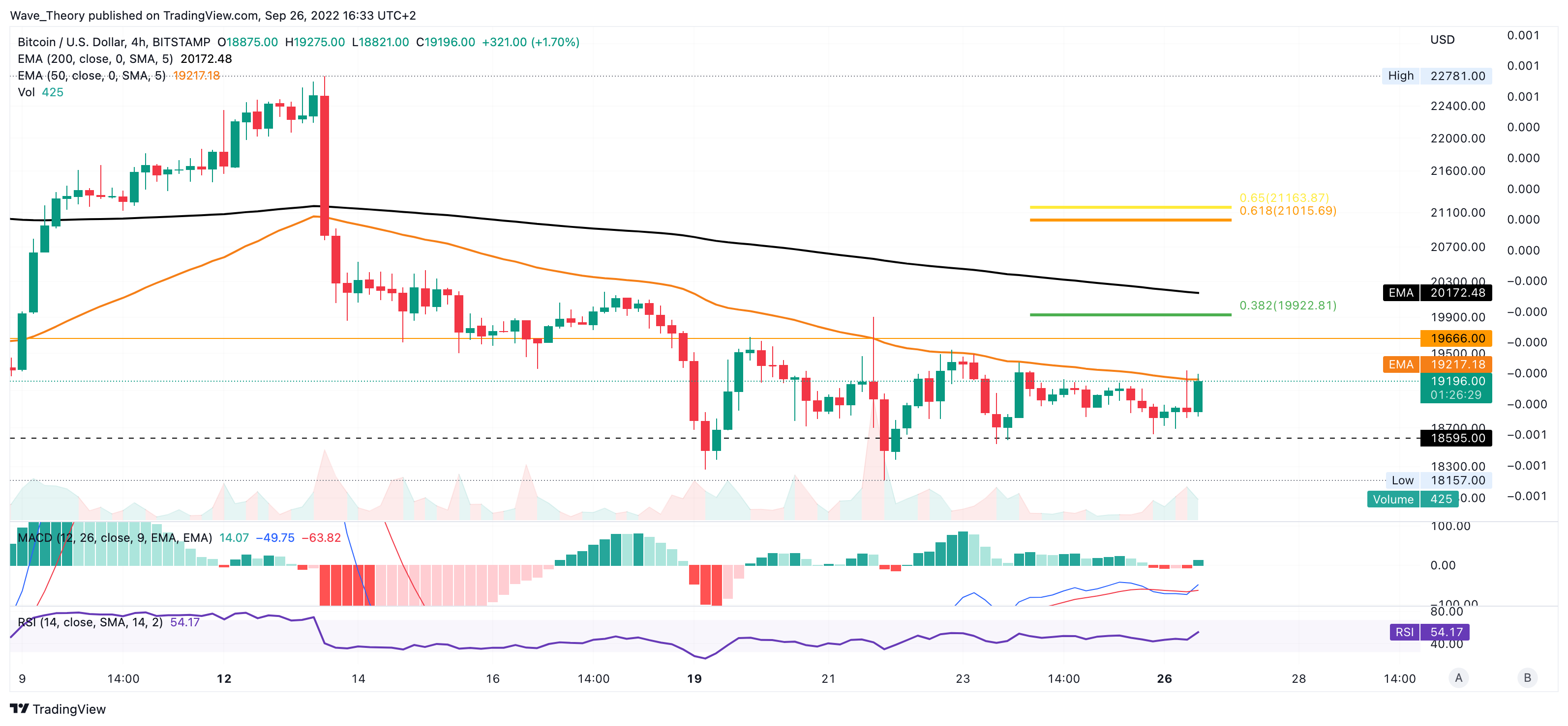 Im 4H-Chart fungiert der 50-4H-EMA als entscheidender Widerstand, denn dieser Widerstand wurde seit des Preissturzes von rund 22.781 USD auf 19.666 USD nicht mehr gebrochen. Ein Bruch des 50-4H-EMAs wäre definitiv ein bullisches Zeichen, woraufhin BTC auf rund 19.923 USD steigen könnte.
