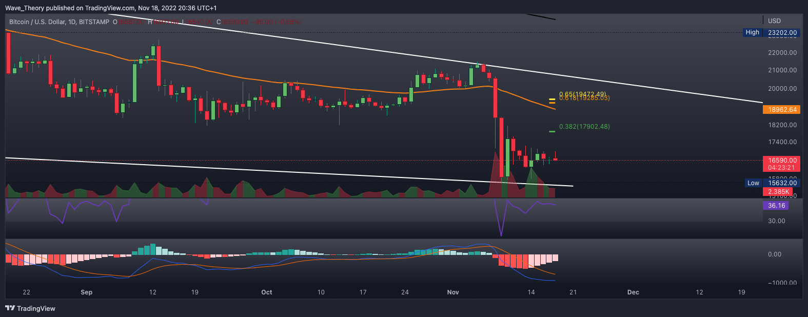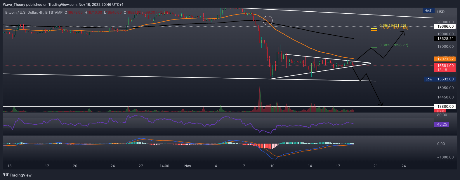 Im 4H-Chart befindet sich der Bitcoin Kurs in einem neutralen symmetrischen Dreieck Kursmuster, aus welchem Bitcoin sowohl bullisch als auch bärisch ausbrechen könnte. Sollte Bitcoin bärisch ausbrechen, könnte an der Trendlinie des letzten Tiefpunkt bei rund 15.500 USD korrigieren.