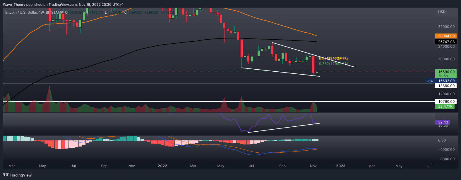 Im Monatschart tickt das Histogramm des MACDs noch immer bullisch höher, obschon Bitcoin ein neues Jahrestief erreicht hat. Sollte BTC die Abwärtsbewegung fortsetzen, findet er spätestens zwischen 10.760 USD und 13.880 USD signifikante Unterstützung.