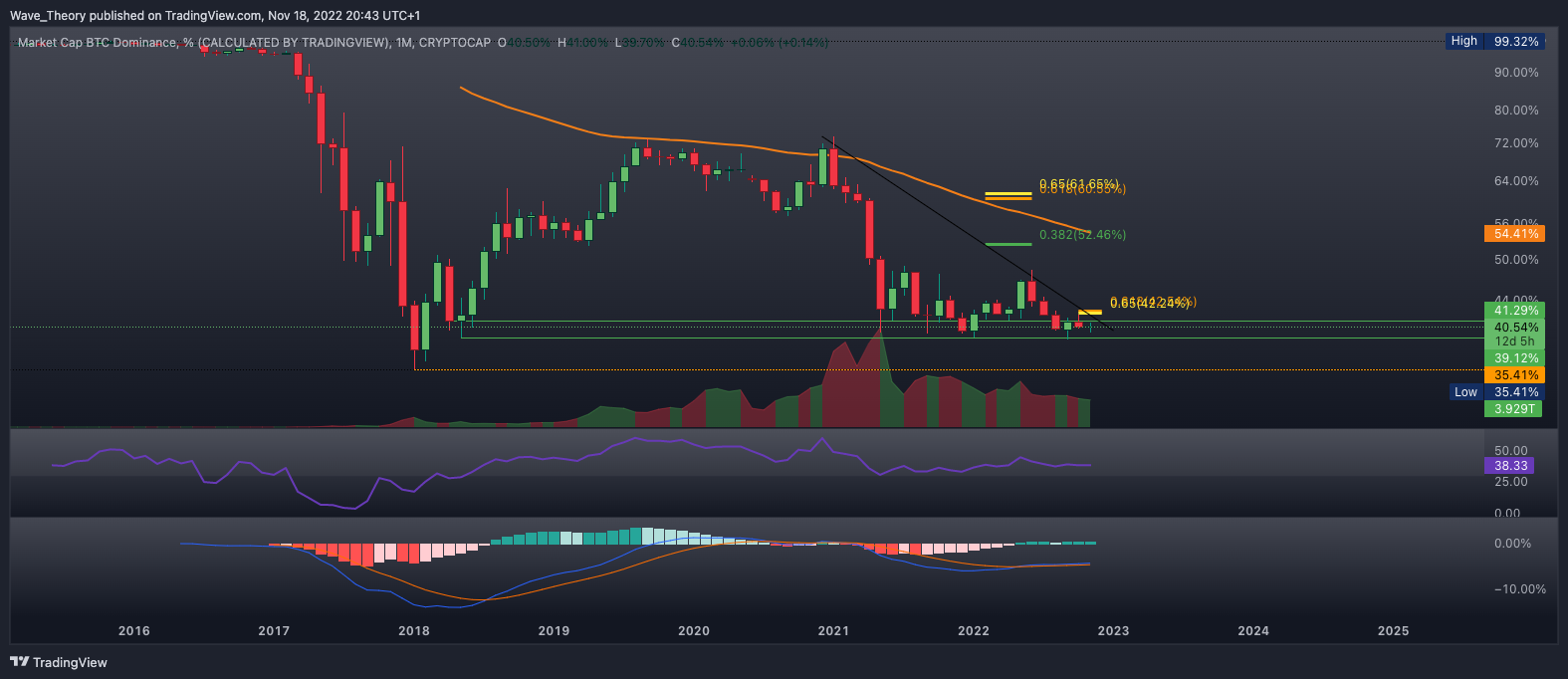 Die Bitcoin Dominanz befindet sich noch immer am Unterstützungsniveau zwischen 39 % und 41,3 %