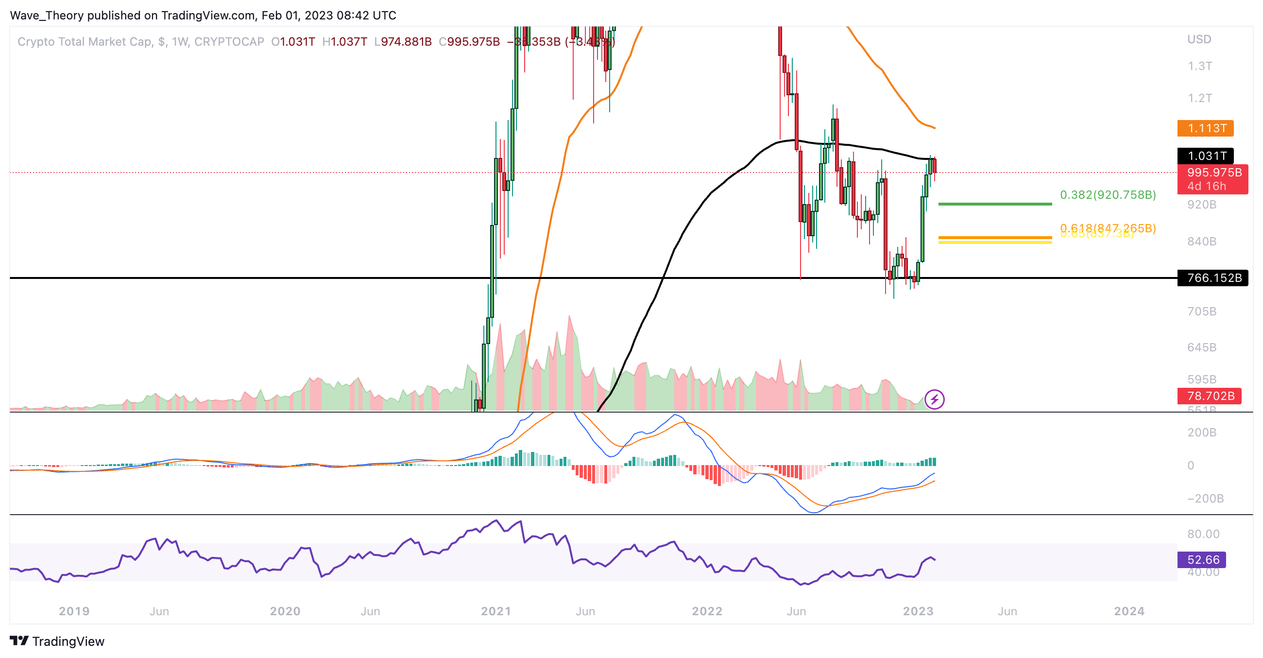 Die Marktkapitalisierung des Kryptomarktes konnte im Januar über 38 % in die Höhe schießen. Darüber hinaus tickt das Histogramm des MACDs im Wochenchart immer noch bullisch höher, während die MACD Linien bullisch überkreuzt bleiben. Trotzdem stößt der Kryptomarkt jetzt am 200-Wochen-EMA bei rund 1,03 Billionen USD auf signifikanten Widerstand.