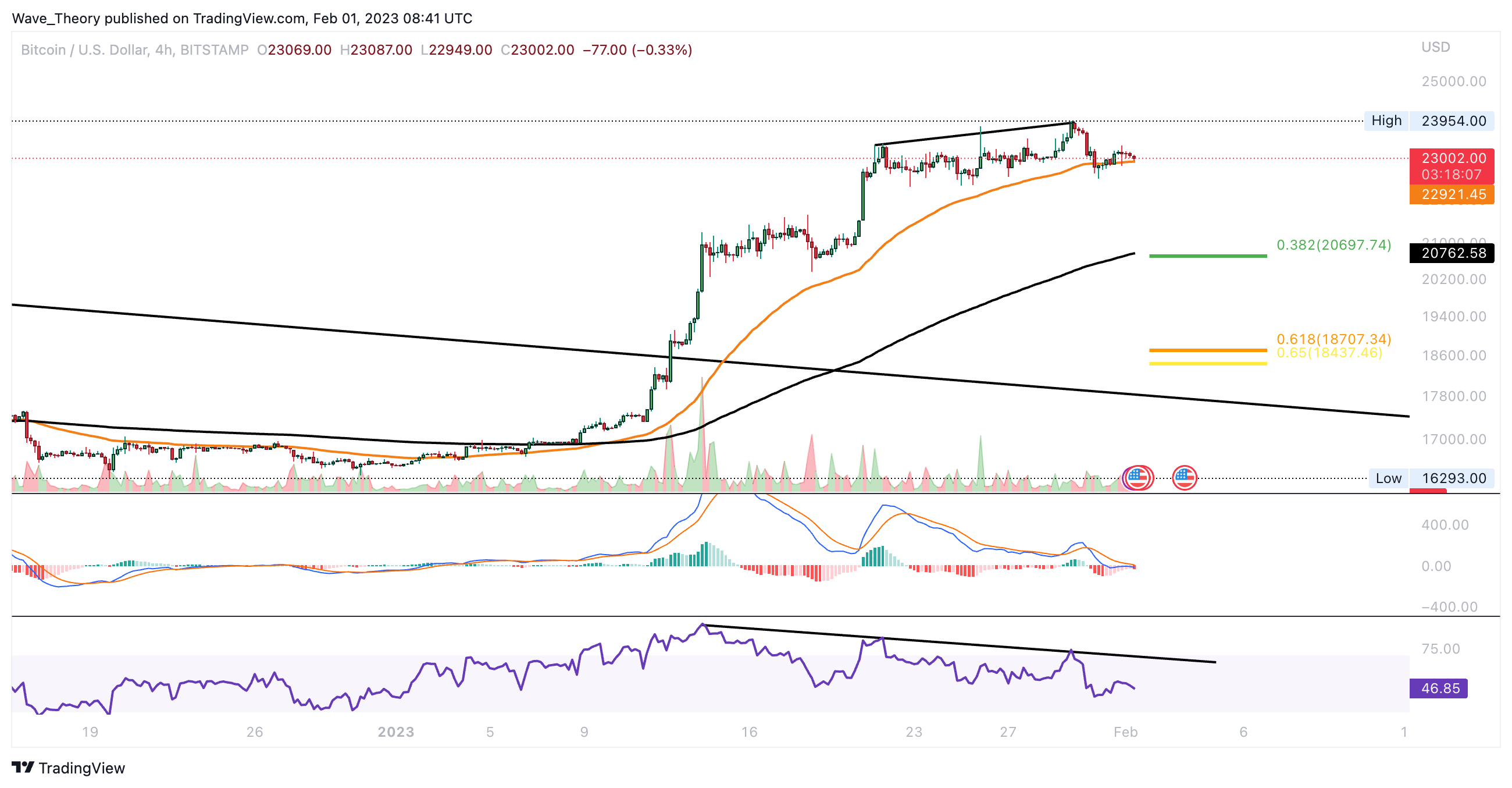 Auch im 4H-Chart zeichnet der RSI eine bärische Divergenz ab. Wenn der BTC Kurs jetzt den 50-4H-EMA bei rund 22.922 USD bricht, könnte ein Kurssturz zu den nächsten Fib Niveaus bei rund 20.700 USD respektive 18.700 USD erfolgen.