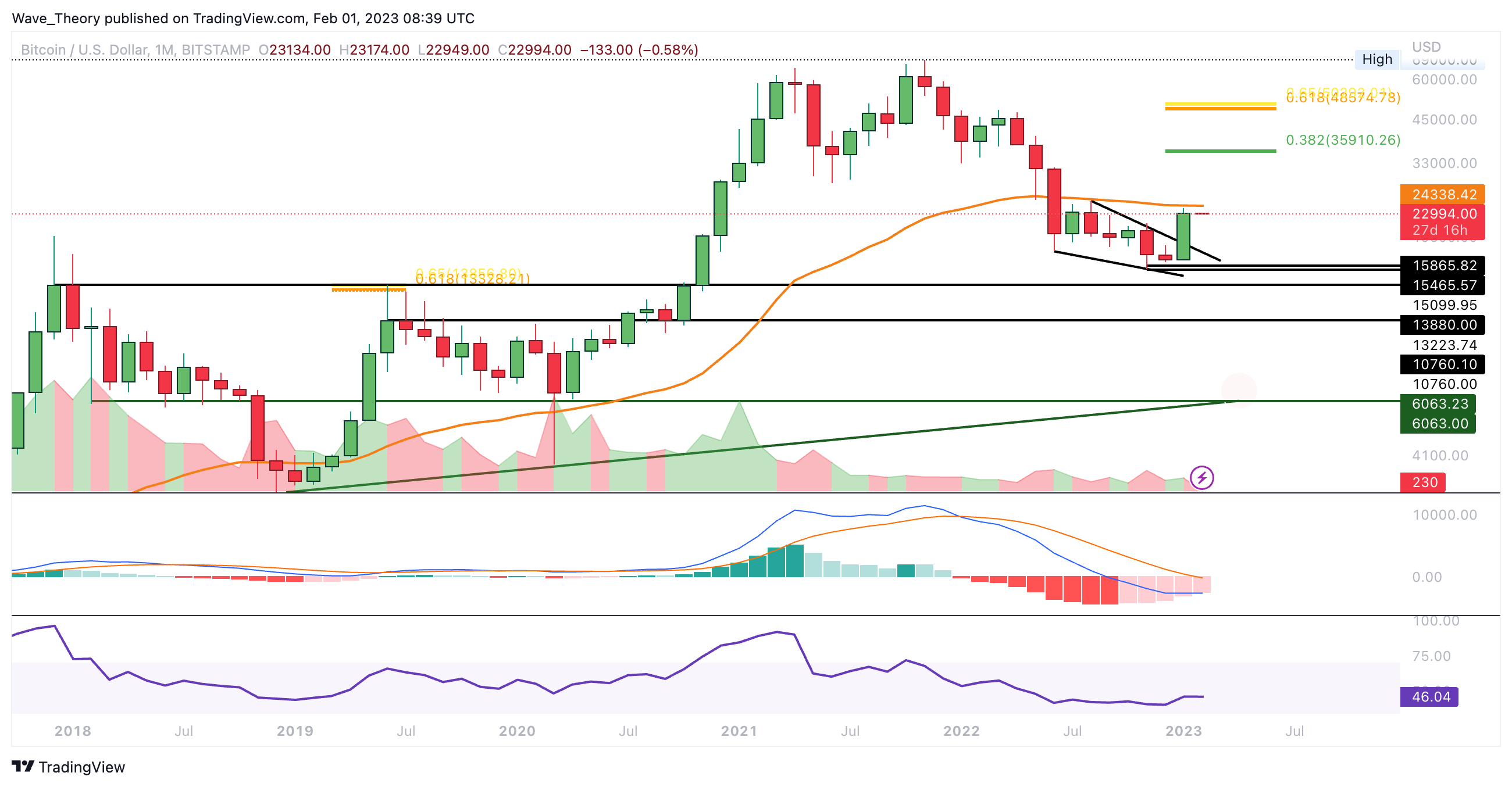 Ansonsten tickt das Histogramm des MACDs im Monatschart noch immer bullisch höher, während sich der RSI neutral zeigt. Die MACD Linien sind dabei aber noch bärisch überkreuzt. Mittelfristig könnte Bitcoin die Fib Niveaus bei rund 36.000 USD und rund 50.000 USD anvisieren.
