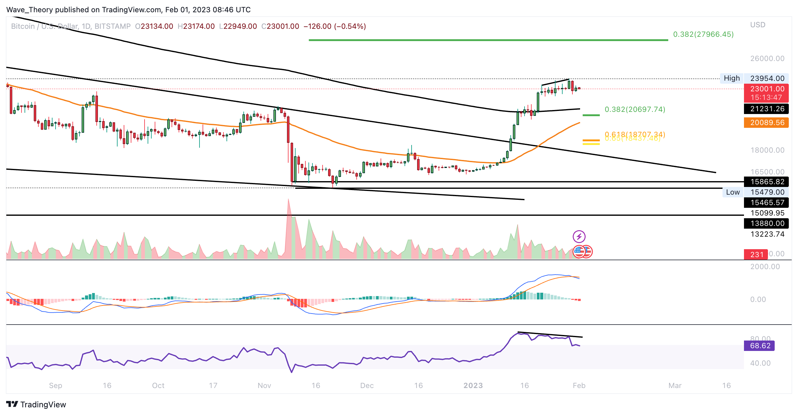 Dann könnte Bitcoin die nächsten Fib Widerstände bei rund 28.000 USD respektive 36.000 USD anvisieren. Ansonsten tickt das Histogramm des MACDs im Wochenchart noch immer bullisch höher und die MACD Linien sind auch bullisch überkreuzt. Der RSI befindet sich dabei in neutralem Territorium.
