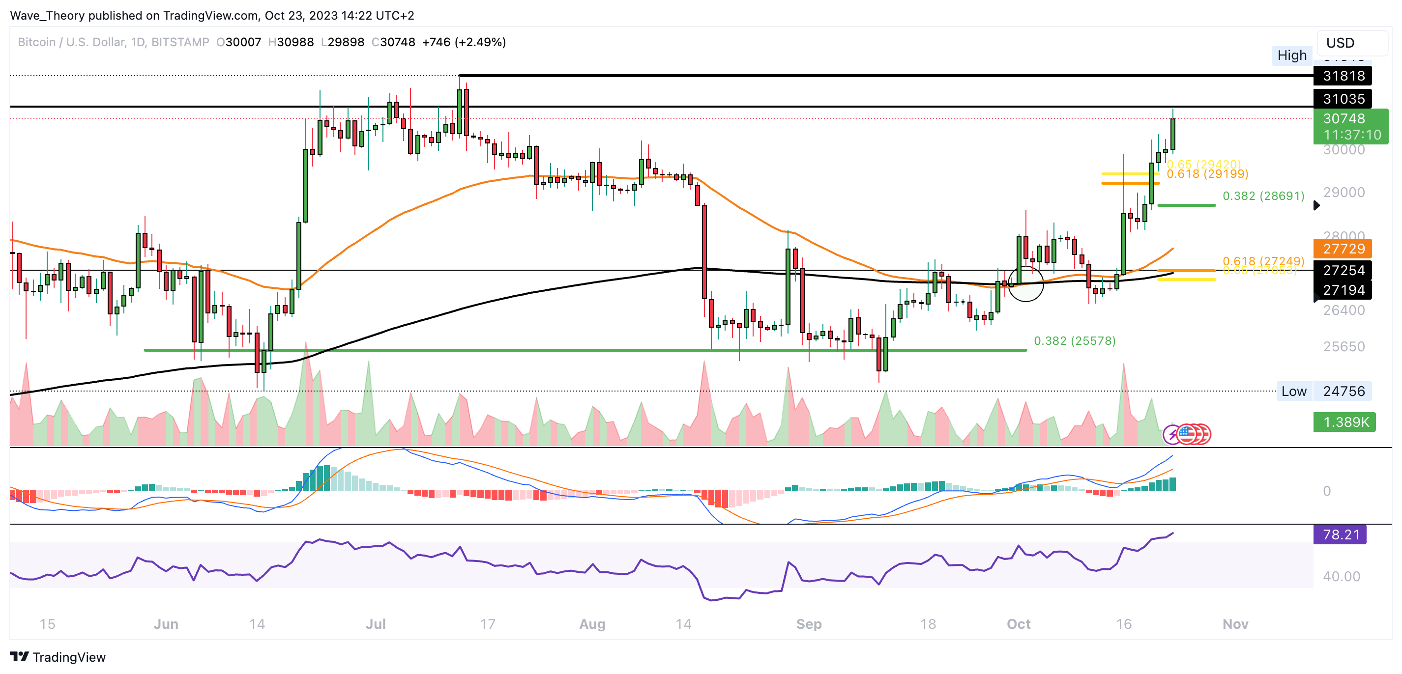 Dabei warten bei rund 28.691 USD und 27.200 USD die nächsten signifikanten Fibonacci Unterstützungen. Dort könnte BTC bullisch abprallen, um die Aufwärtsbewegung fortzusetzen.
