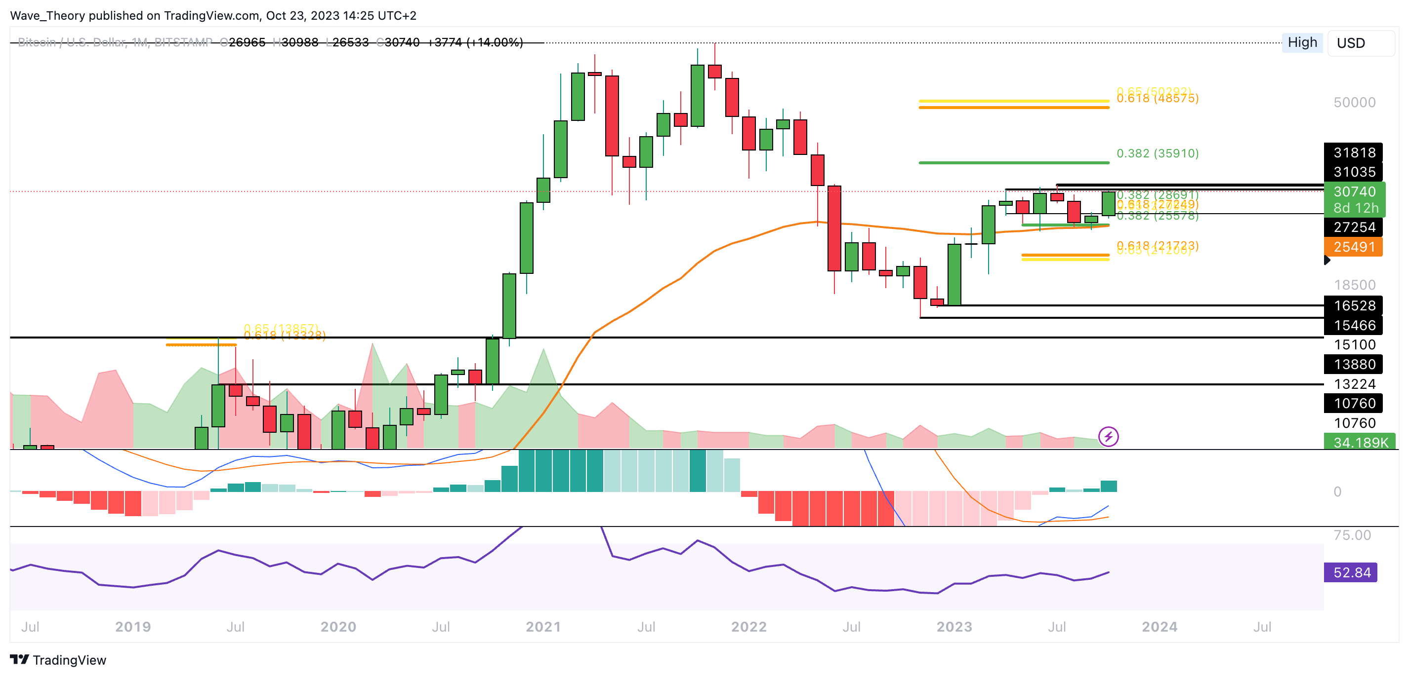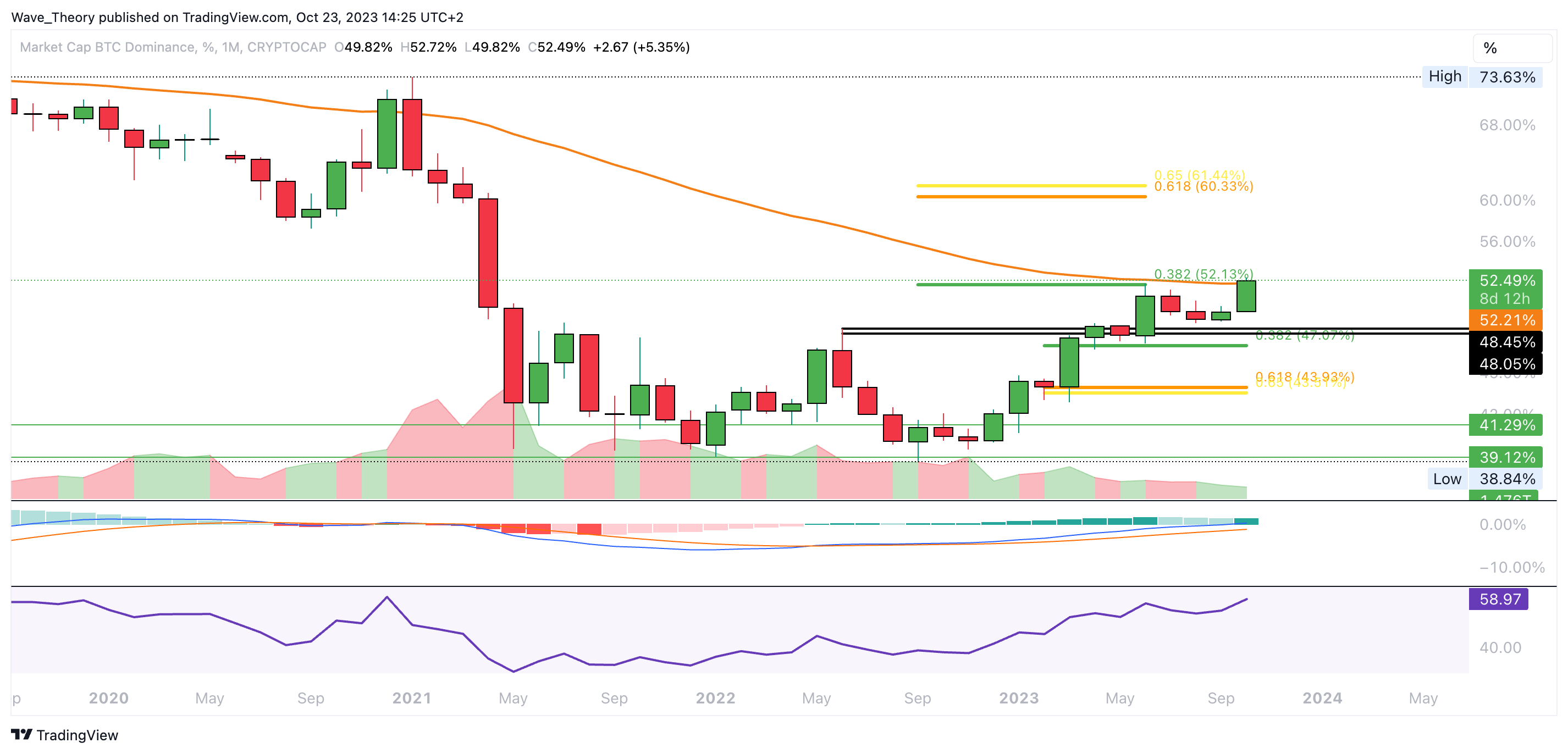 Die Bitcoin Dominanz ist ein hilfreiches Krypto-Tool, um Bitcoins Marktanteil zu bewerten. Aktuell ist sie im Begriff, den 50-Monate-EMA Widerstand am 0,382 Fib Niveau bei rund 52,2 % bullisch zu brechen.