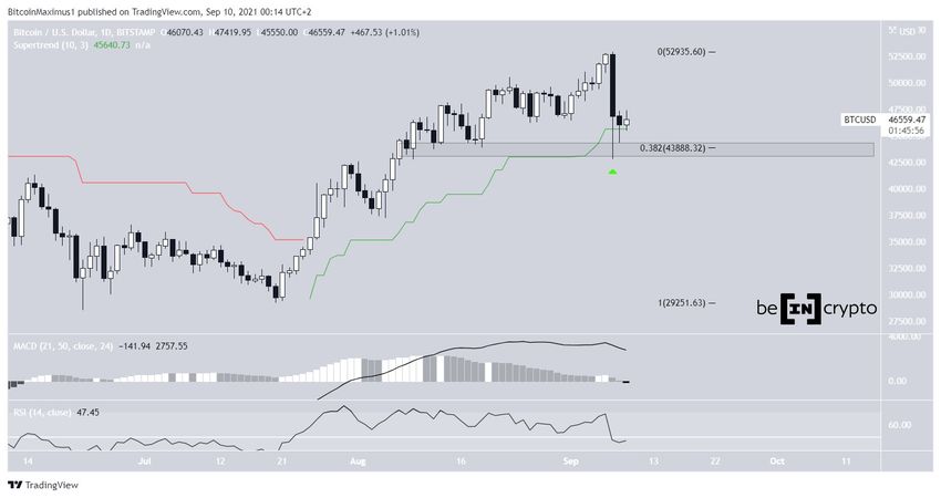Bei dem Bounce validierte der Bitcoin Kurs den horizontalen Bereich bei 43.900 USD als Support. Dort befindet sich das 0.382-Fib-Retracement-Level und ein horizontaler Unterstützungsbereich. Außerdem wurde die Trendlinie des Supertrend-Indikators als Support validiert.