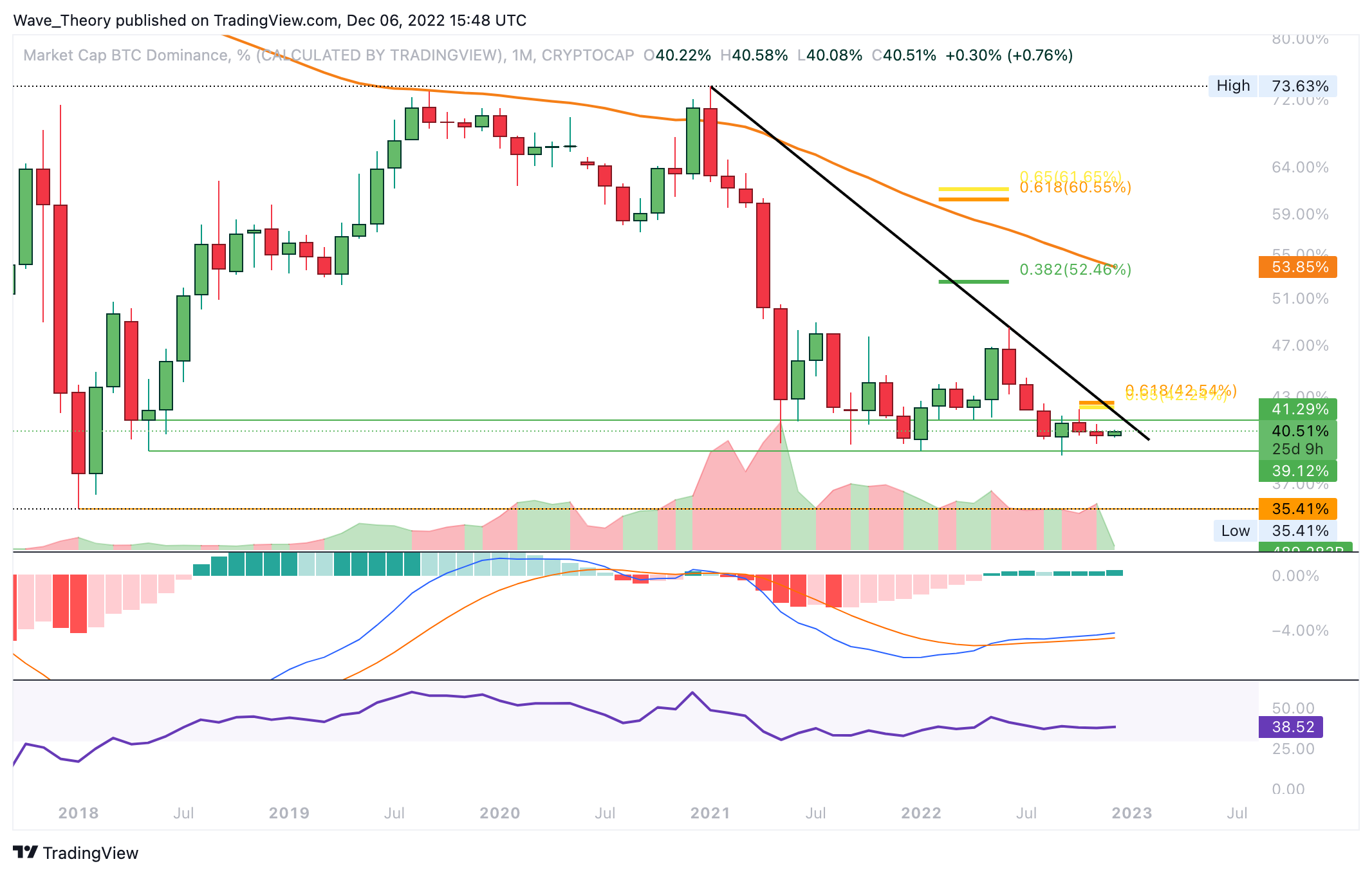 Bricht Bitcoin die Unterstützung zwischen 39 % und 41,3 %, könnte Bitcoin auf das ATL bei rund 35,41 % fallen. Bricht Bitcoin jedoch den Golden Ratio Widerstand bei rund 42,5 %, könnte die Bitcoin Dominanz auf rund 52,5 % steigen.