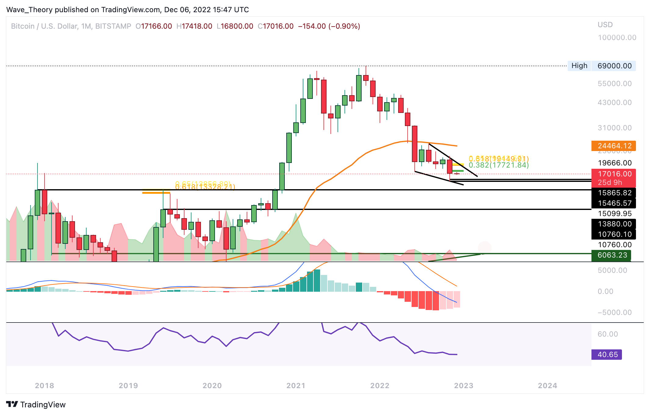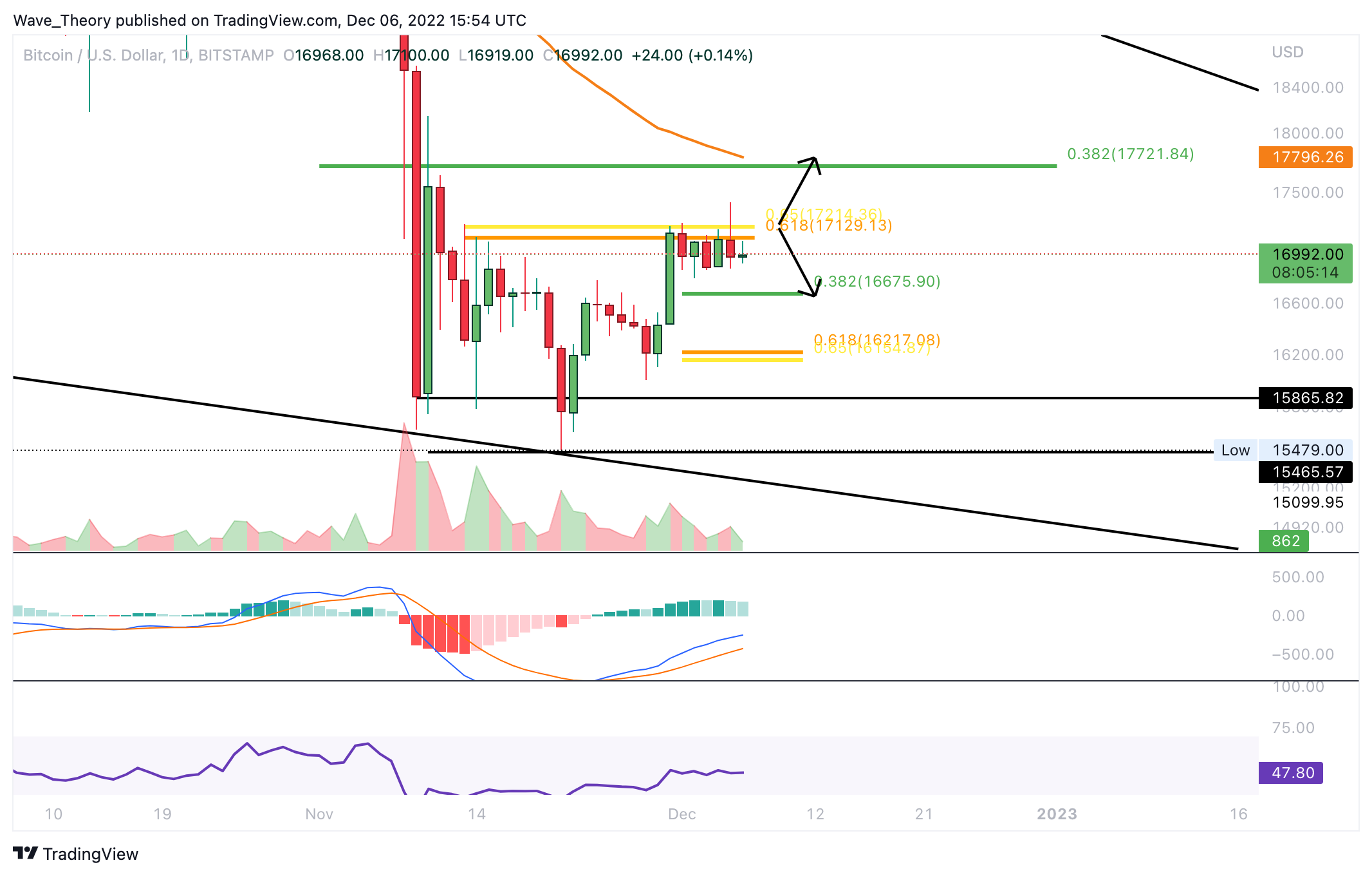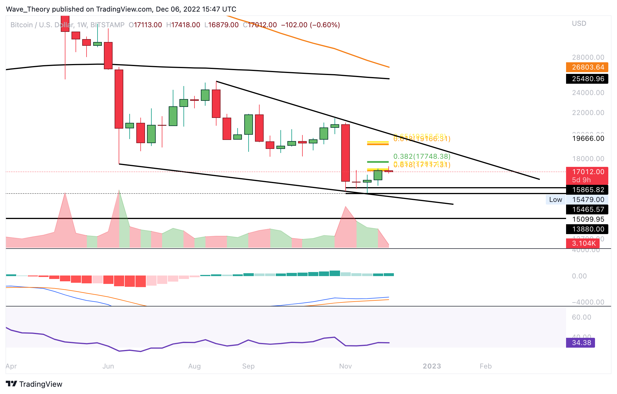 Bullisch zu betrachten ist aber, dass im Monatschart das Histogramm des MACDs immer noch bullisch höher tickt, obwohl der November sehr bärisch für BTC verlief. Dennoch könnte BTC sehr stark abstürzen, wenn Bitcoin die aktuelle Unterstützung zwischen rund 15.465 USD und 15.865 USD bricht.