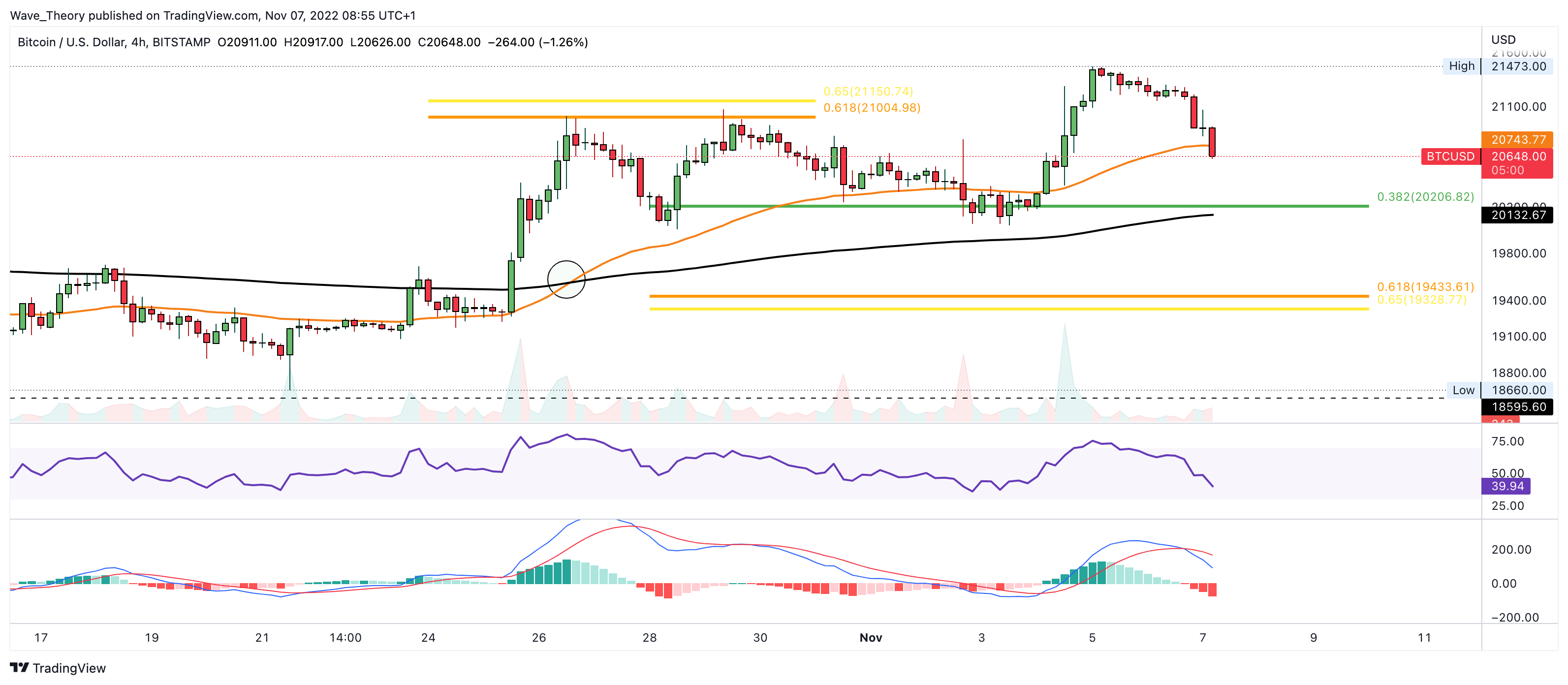 Trotz der zahlreichen Indikatoren für eine bullische Trendumkehr von BTC, sieht es kurzfristig eher bärisch für BTC aus. So konnte der BTC Kurs die Golden Ratio bei rund 21.000 USD zwar brechen, jedoch leitete der BTC Kurs kurz nach des Erreichens von 21.473 USD eine Korrekturbewegung ein.