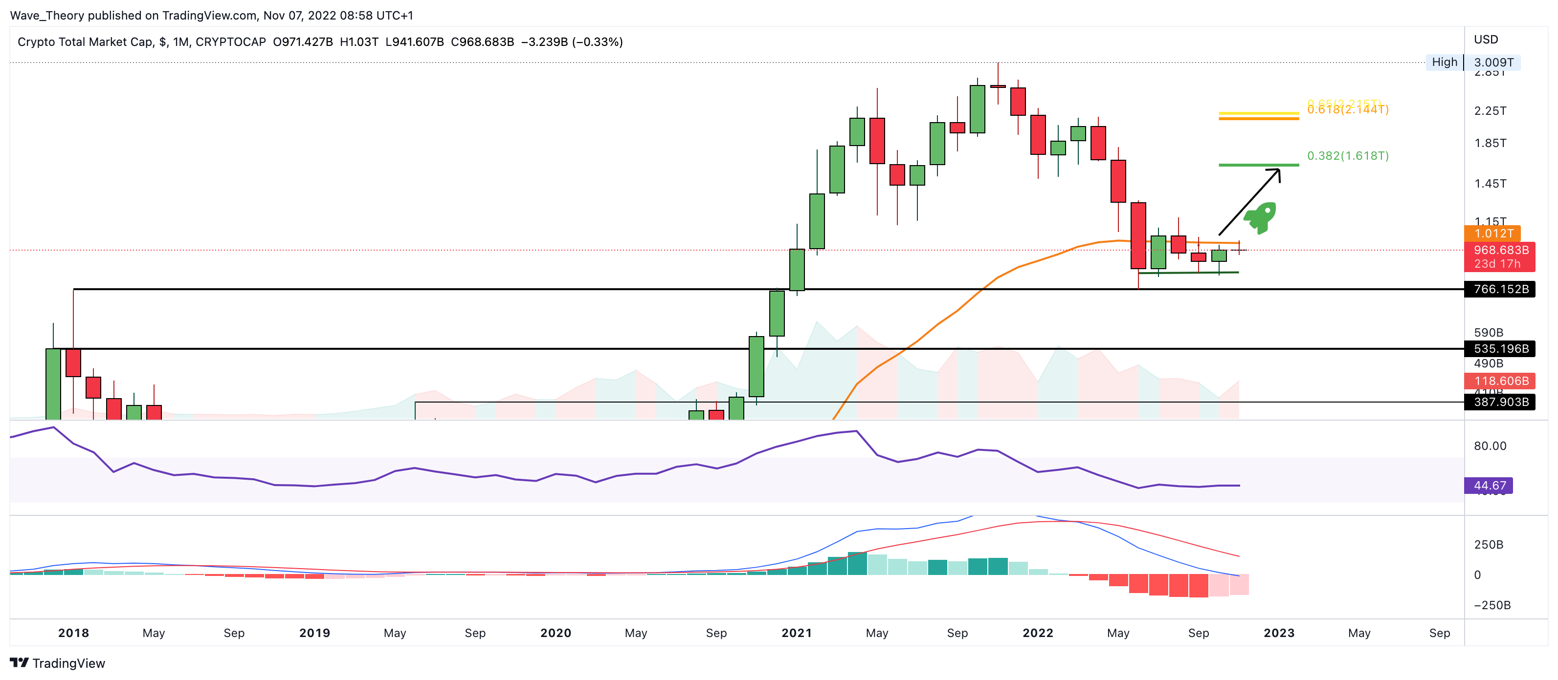 Denn der nächste signifikante Widerstand liegt dann erst wieder bei rund 1,618 Billionen USD. Zudem tickt auch hier das Histogramm des MACDs seit letztem Monat bullisch höher. Darüber hinaus konnte sich der Kryptomarkt fünf Monate in Folge über der horizontalen Unterstützung bei rund 850 Milliarden USD halten.