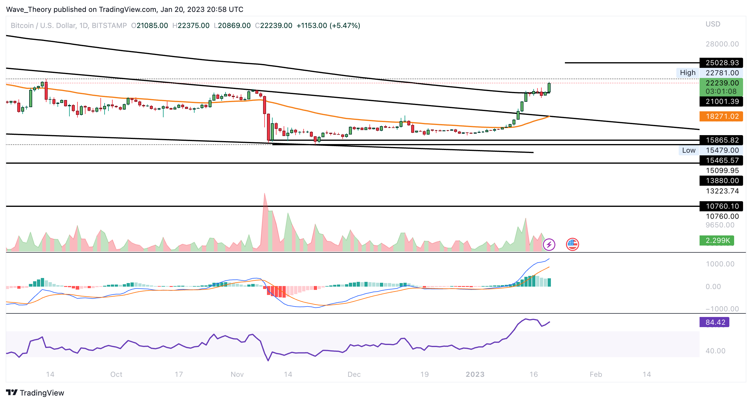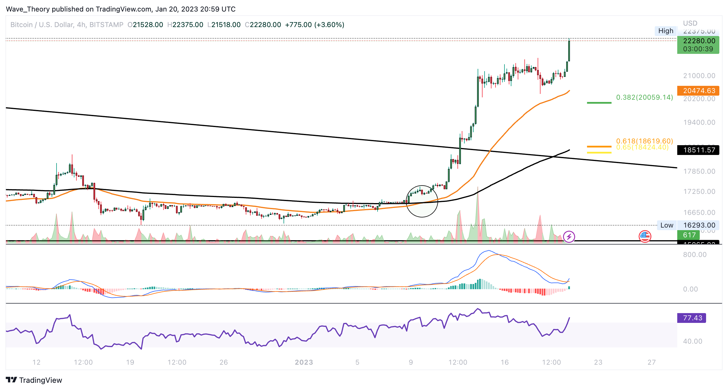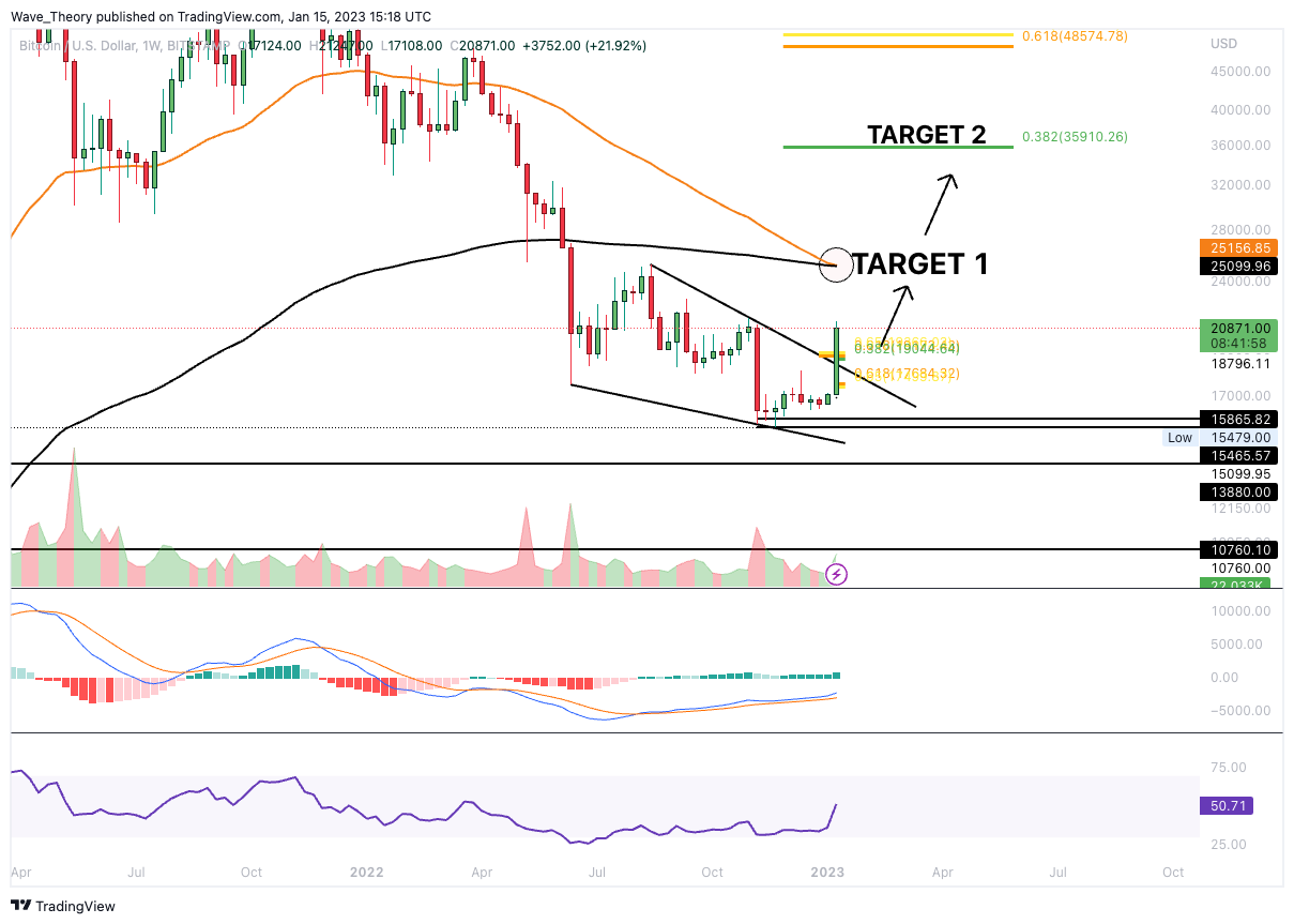 In der letzten BTC Kurs Prognose schrieben wir: “Der Bitcoin Kurs konnte bereits rund 37,3 % steigen, seit der BTC Preis den Tiefpunkt in diesem Zyklus bei rund 15.480 USD erreicht hatte. Dabei konnte BTC auch den Golden Ratio Widerstand bei rund 19.250 USD brechen und bullisch aus dem Falling Wedge Kursmuster ausbrechen.