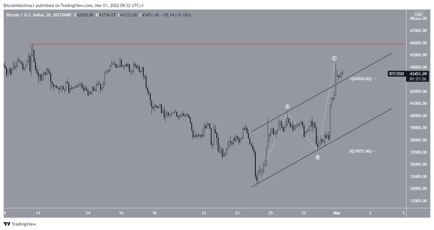 Bei der ersten Variante ist die aktuelle Aufwärtsbewegung Teil einer A-B-C-Korrekturstruktur, wobei die A und die C-Welle ein nahezu exaktes 1:1-Verhältnis haben. Bei dieser Variante wäre die kurzfristige Aufwärtsbewegung bereits abgeschlossen. Da die Spitze der C-Welle jedoch über der Widerstandslinie des unten gezeigten Channels liegt, erscheint diese Variante eher unwahrscheinlich. Sollte der Bitcoin Kurs über den Hochpunkt vom 10. Februar 2022 ansteigen, dann ist diese Wellenzählung ungültig.