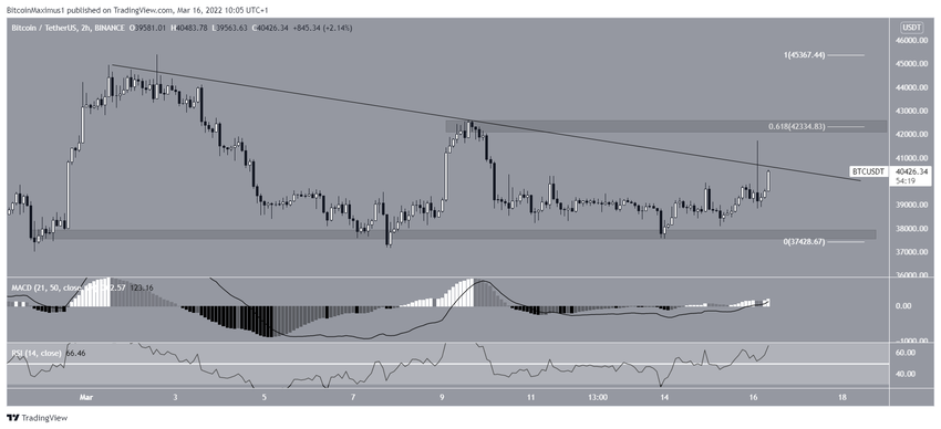 Der Bitcoin Kurs konnte heute, am 16. März 2022, auf über 41.718 USD ansteigen. Allerdings wurde der BTC Kurs bei der unten gezeigten Widerstandslinie abgelehnt, die seit dem 1. März 2022 besteht. Seit dem 1. März ist der Bitcoin Kurs außerdem dreimal von dem Support-Level bei 37.700 USD abgeprallt, und hat jedes Mal einen höheren Tiefpunkt erreicht – ein bullisches Zeichen.