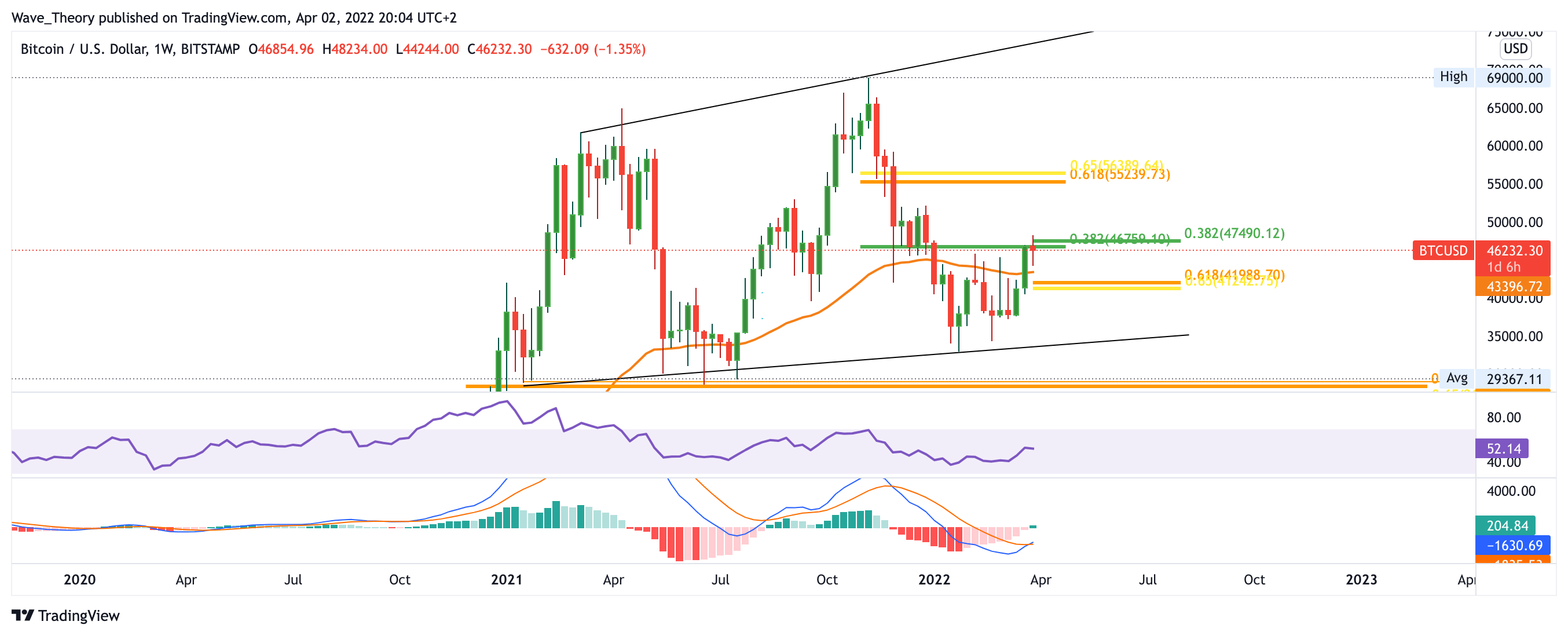 Der Bitcoin Kurs stößt diese Woche am 0,382 Fib Widerstand bei rund 47.000 USD auf bärische Ablehnung und sollte der Bitcoin Kurs in den nächsten 24 Stunden nicht deutlich steigen, wird die Wochenkerze womöglich bärisch für den BTC Kurs schließen. Der MACD zeigt sich dennoch noch immer eindeutig bullisch. Bitcoin könnte also nach einer kurzen Korrektur erneut den Versuch unternehmen, das 0,382 Fib Niveau bei rund 47.000 USD zu brechen, um zur wichtigen Golden Ratio bei rund 56.000 USD zu steigen.