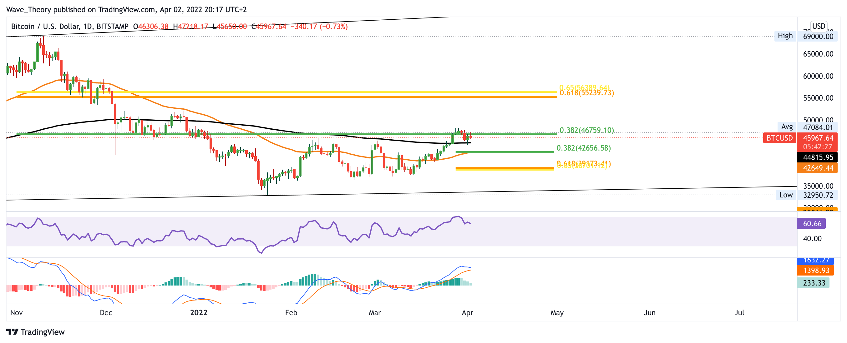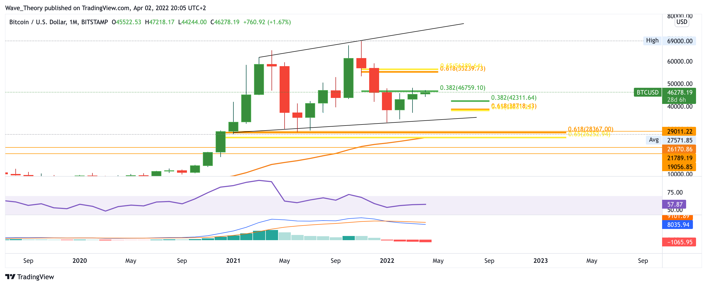 Sollte Bitcoin endgültig an einer der Fibonacci Widerstände abgewiesen werden, bestätigt dies den Bärentrend und Bitcoin kann nicht aus seiner Korrekturphase ausbrechen. Dementsprechend könnte Bitcoin auch zur wichtigen Unterstützung zwischen 26.000 – 31.000 USD zurückkehren. Aktuell sieht es aber noch sehr bullisch aus und Bitcoin könnte in den nächsten Wochen womöglich das 0,382 Fib Niveau bei rund 47.000 USD bullisch durchbrechen, um zur Golden Ratio bei rund 56.000 USD zu steigen. Im Monatschart zeigt sich der MACD trotz bullischer Chancen dennoch noch immer entschieden bärisch.
