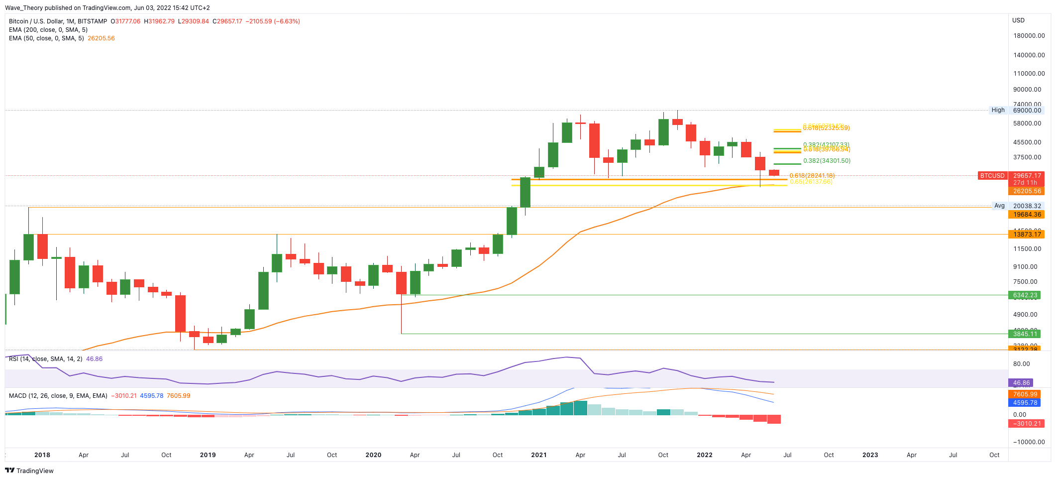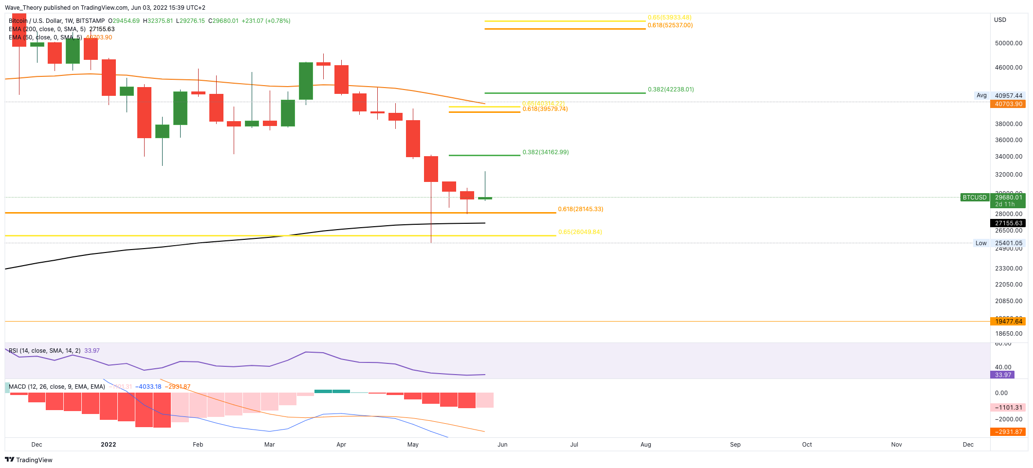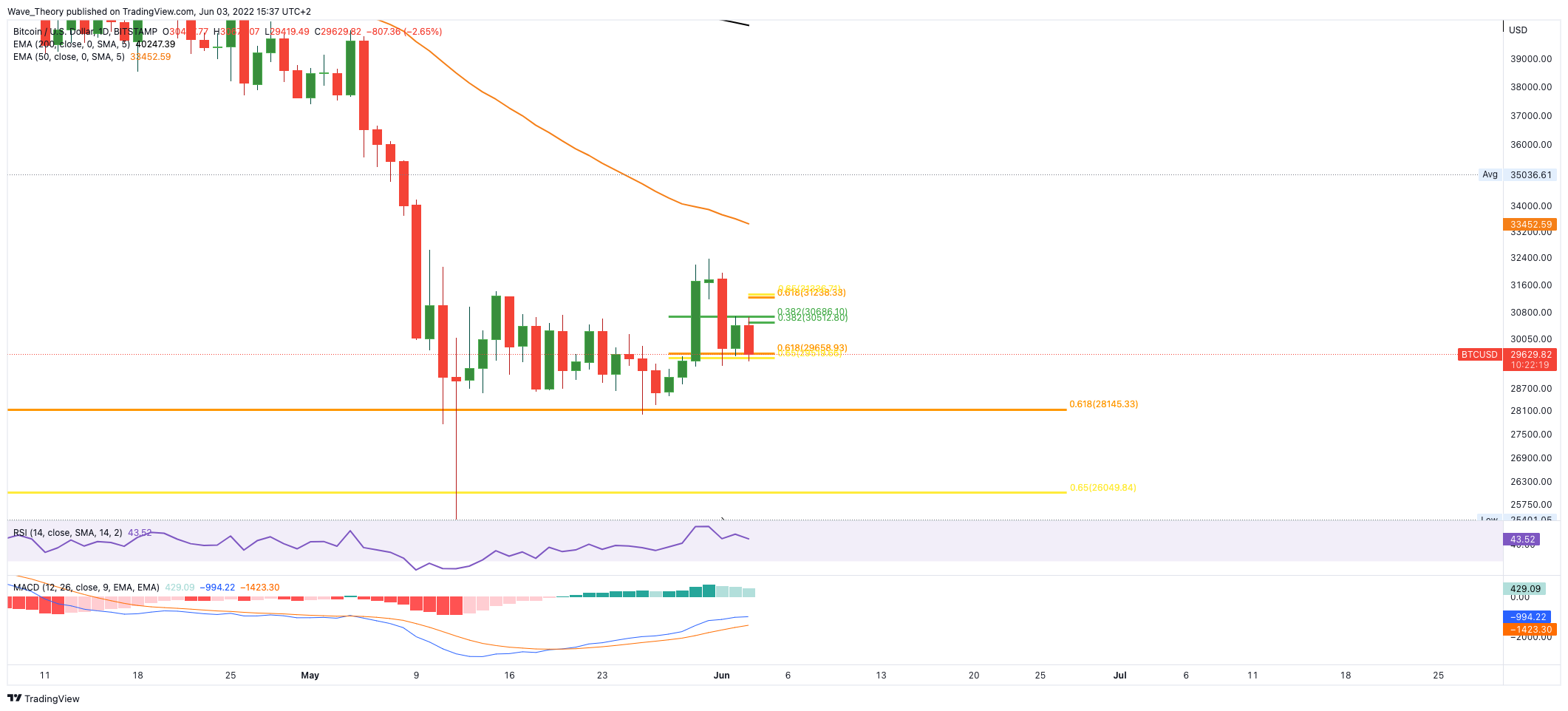 Damit also die bullische Impulswellenbewegung zwischen dem 28. Mai – 31. Mai ihr bullisches Momentum nicht verliert, darf Bitcoin nicht unter die Golden Ratio bei rund 29.500 USD fallen.