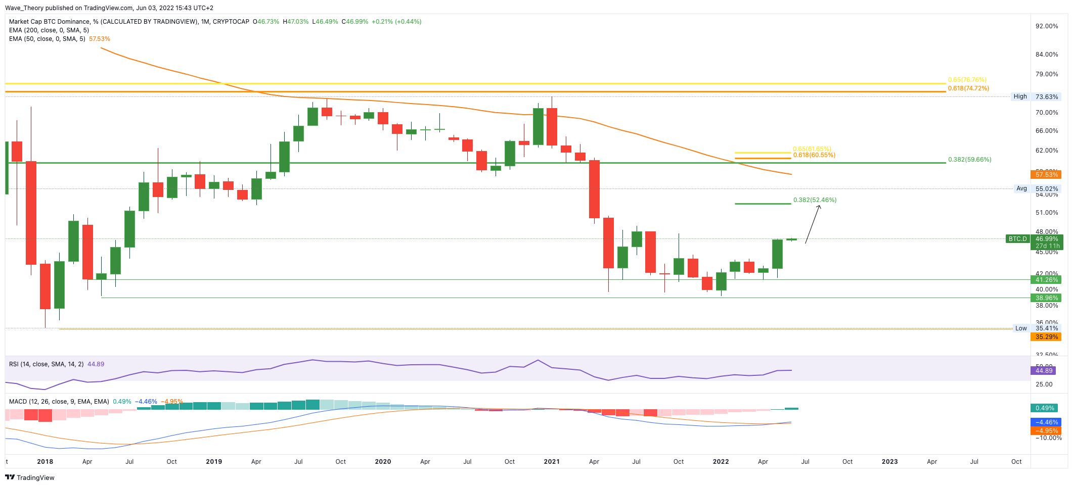 Damit findet die BTC Dominanz nun bei rund 52 % den nächsten Widerstand, denn dort stößt die Bitcoin Dominanz auf das 0,382 Fib Niveau. Bricht Bitcoin diesen Widerstand, könnte er auf rund 60 % Dominanz steigen, denn dort trifft Bitcoin auf den Golden Ratio Widerstand.