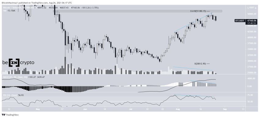 Auf dem 6-Stunden-Chart gibt es ebenfalls eine bärische Divergenz auf dem MACD und auf dem RSI zu sehen, die sich vor der Abwärtsbewegung entwickelt haben. Außerdem folgt der Bitcoin Preis seit dem 20. Juli 2021 einer aufsteigenden Support-Linie. Der BTC Kurs ist gerade dabei, unter diese Linie auszubrechen. Sollte das passieren, dann könnten wir eine Abwärtsbewegung sehen, die in bzw. bei dem horizontalen Unterstützungsbereich bei 42.400 USD endet. Dort befindet sich zudem das 0.382-Fib-Retracement-Level.