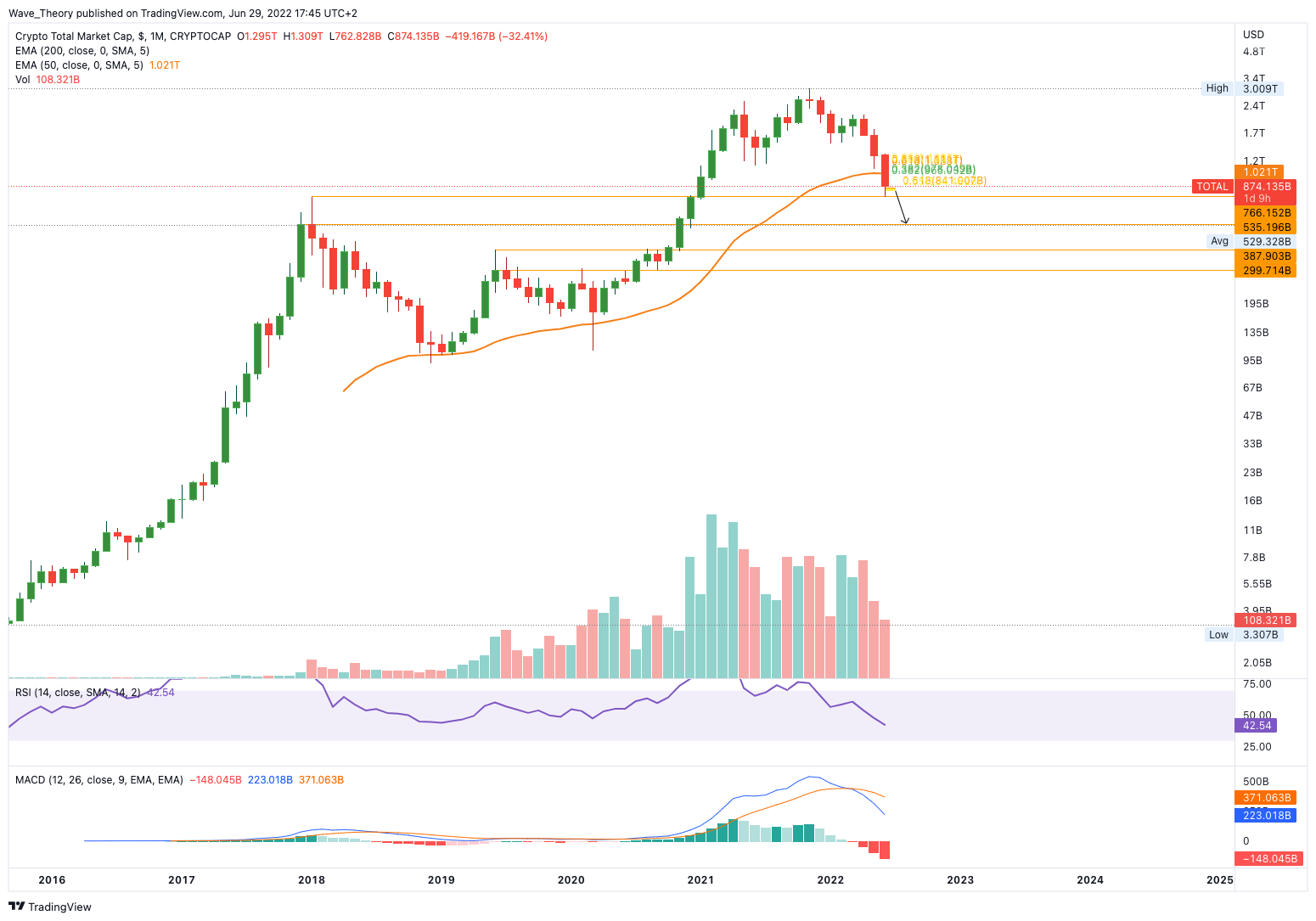 Jedoch zeigt sich der Monatschart auch hier eindeutig bärisch. So tickt das Histogramm des MACDs weiterhin bärisch tiefer und die MACD Linien bleiben bärisch überkreuzt. Bricht der Kryptomarkt die Unterstützung bei rund 1 Billion USD bärisch, könnte der Kryptomarkt tiefer in die Unterstützungszone zwischen 535 – 766 Milliarden USD eindringen und gegebenenfalls das untere Ende der Unterstützung bei rund 535 Milliarden USD erreichen.