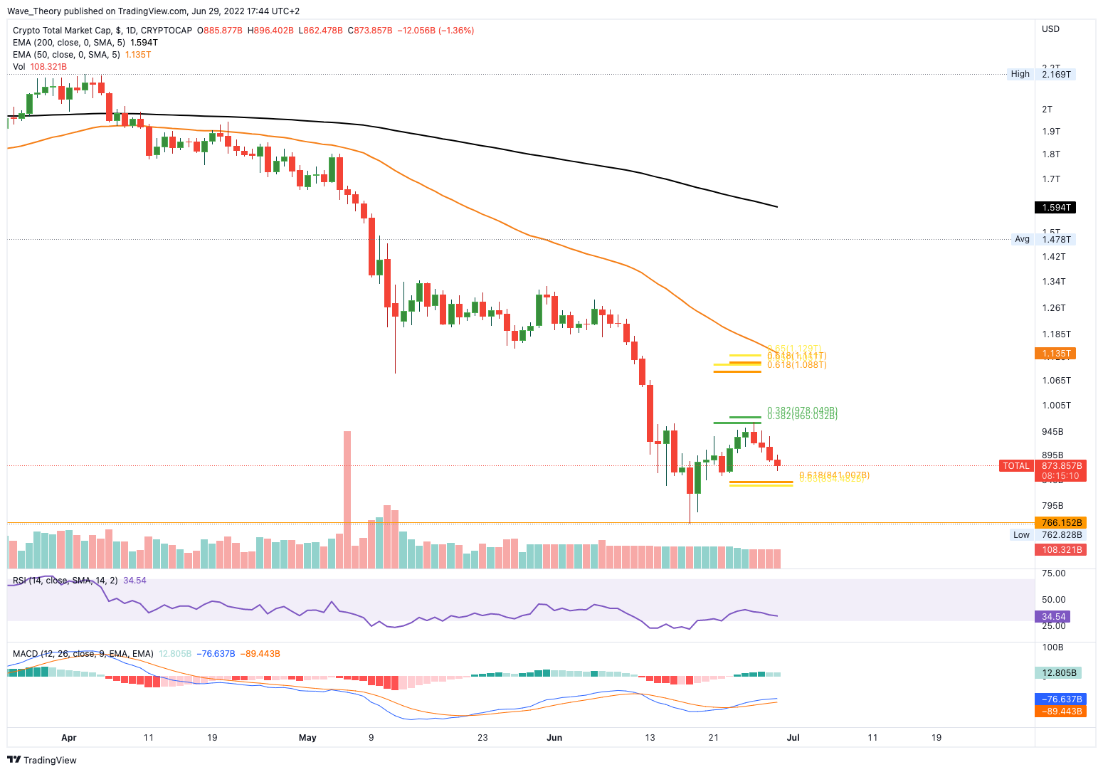Der Kryptomarkt prallte an der Unterstützung bei 766 Milliarden USD ab und stieg anschließend zum 0,382 Fib Widerstand bei rund 965 Milliarden USD, woran der Kryptomarkt bärisch abgewiesen wurde. Die Marktkapitalisierung des Kryptomarktes könnte sich jetzt in Richtung der Unterstützung zwischen 535 – 766 Milliarden USD zurückbewegen.
