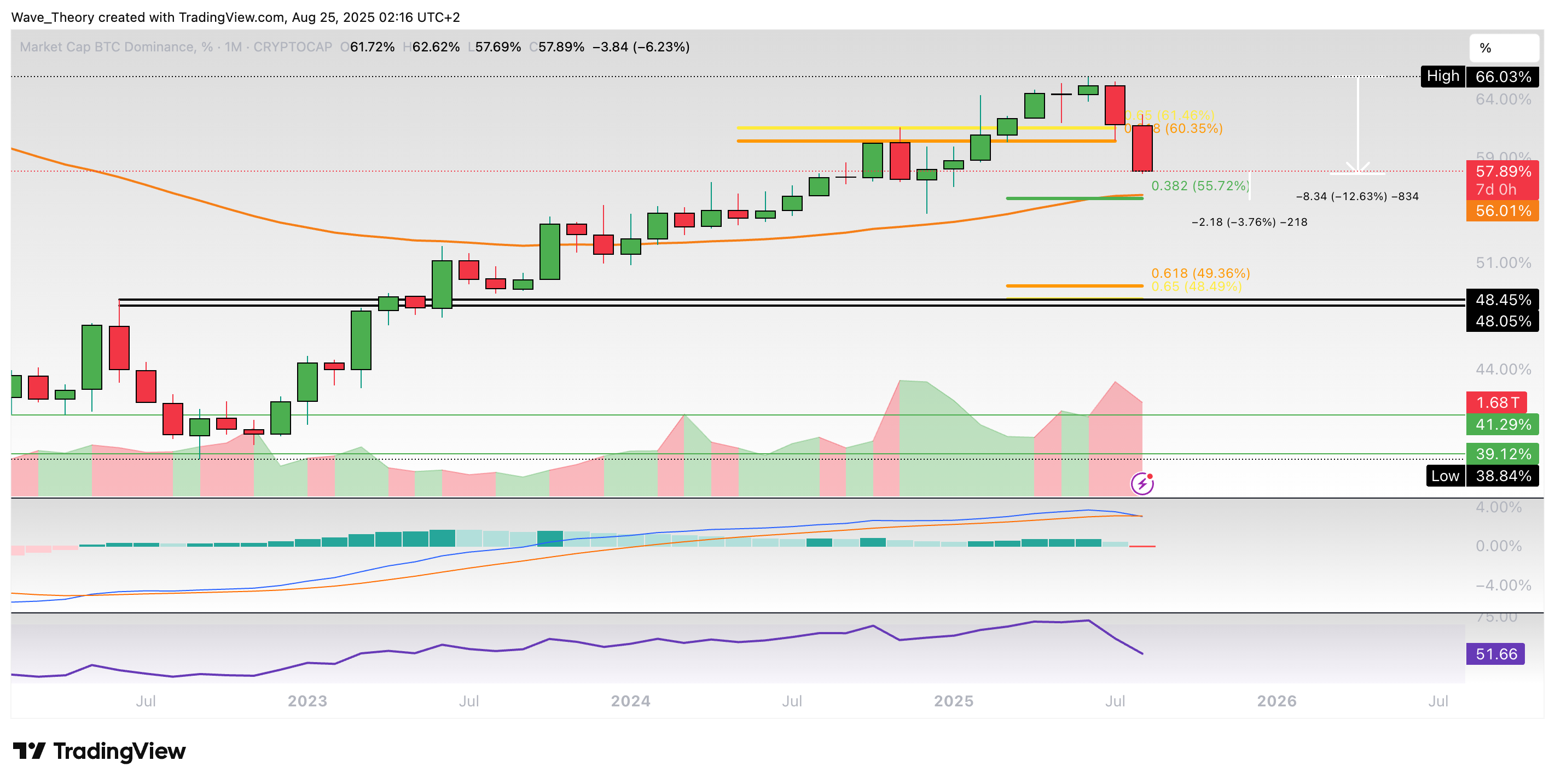 Die Bitcoin Dominanz hat die Golden Ratio Unterstützung bei rund 60,5 % bärisch gebrochen. Damit könnte sie um weitere 4 % fallen, um die 0,382 Fib Unterstützung am 50-Tage-EMA bei rund 56 % zu erreichen.