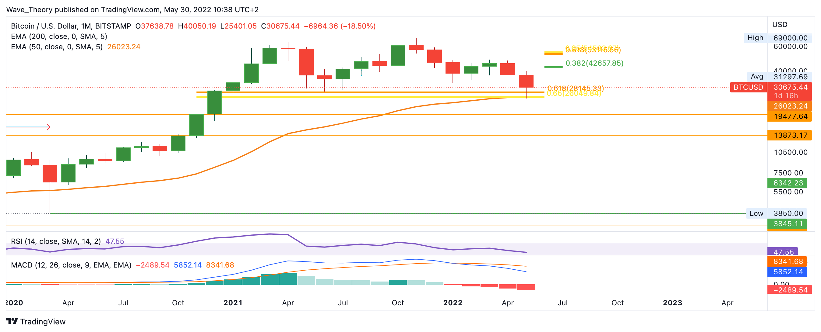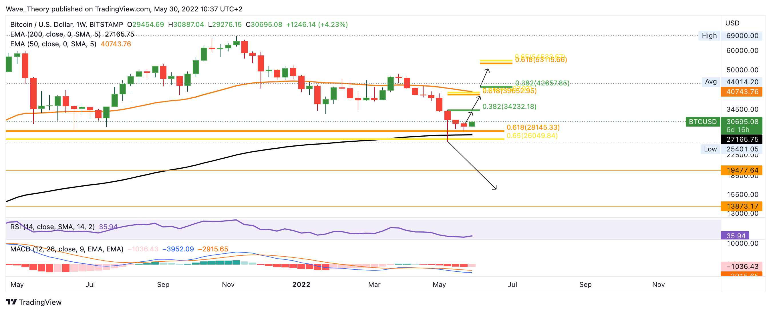 Bricht Bitcoin durch die Golden Ratio Unterstützung bei rund 26.000 USD, wartet erst wieder zwischen 14.000 – 20.000 USD signifikante Unterstützung auf BTC. Sollte Bitcoin nun aber die Fibonacci Widerstände bei rund 34.200 USD und 40.000 USD brechen, müsste er die Widerstände bei rund 43.000 USD und 54.000 USD brechen, um wieder eindeutig bullisch zu werden. Bis dahin befindet sich Bitcoin nämlich immer noch in einer Korrekturphase.
