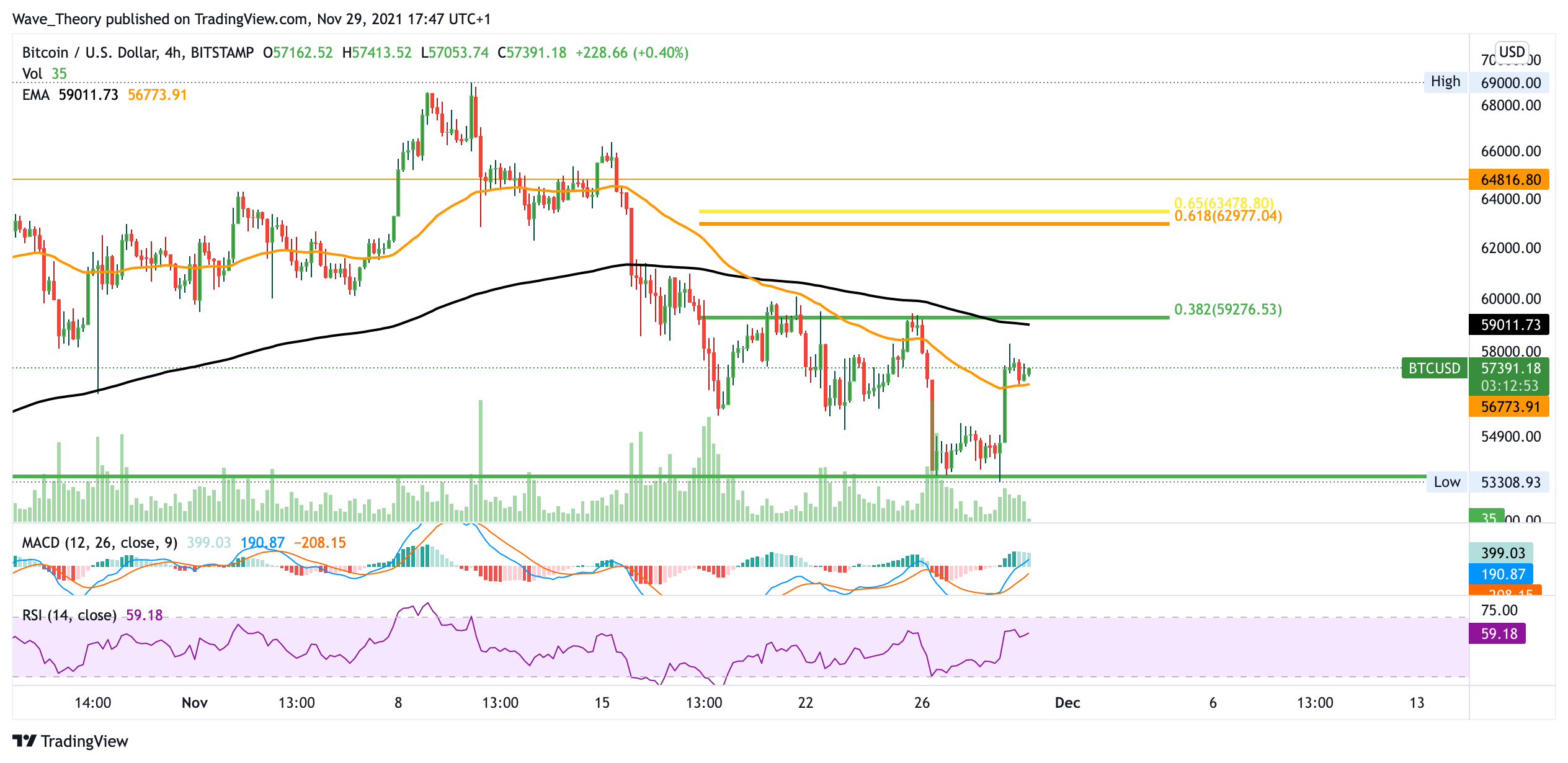 Bis jetzt ist die Korrekturbewegung eine sehr milde Reaktion auf eine derart stark ausgeprägte bärische Divergenz im Monatschart. Zudem zeigen sich bärische und bullische Kräfte im November bisher stark ausgeglichen. Ob die 53.500 USD für dieses Jahr das letzte Korrekturtief markieren, oder ob wir noch die 43.000 USD Marke sehen werden, wird im nächsten Monat ausgetragen. Bitcoin hat ohnehin nur noch wenige Tage, bis das Jahr vorüber ist. Sollte die Monatskerze aber über dem Fib Niveau bei 53.500 USD schließen, wäre dies definitiv ein tendenziell bullisches Zeichen.