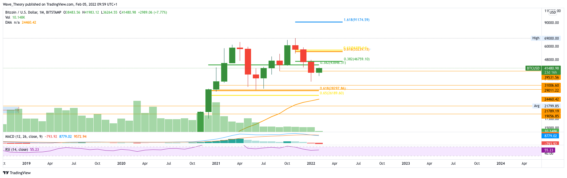 Im Monatschart zeigt sich der BTC Kurs noch immer bärisch: die MACD Linien sind bärisch überkreuzt und das Histogramm tickt noch immer bärisch nach unten. Spätestens zwischen 25.000 – 31.000 USD stößt Bitcoin auf massive Unterstützung. Sollte Bitcoin jedoch seinen Aufwärtstrend fortsetzen, liegen bei rund 47.000 USD und 56.000 USD die entscheidenden Fibonacci Widerstände. Bricht der Bitcoin Kurs die Golden Ratio bei 56.000 USD, liegt das nächste Kursziel am ATH bei rund 69.000 USD. Ist dieses erst einmal gebrochen, steht auch die 100.000 USD Marke wieder in Aussicht.