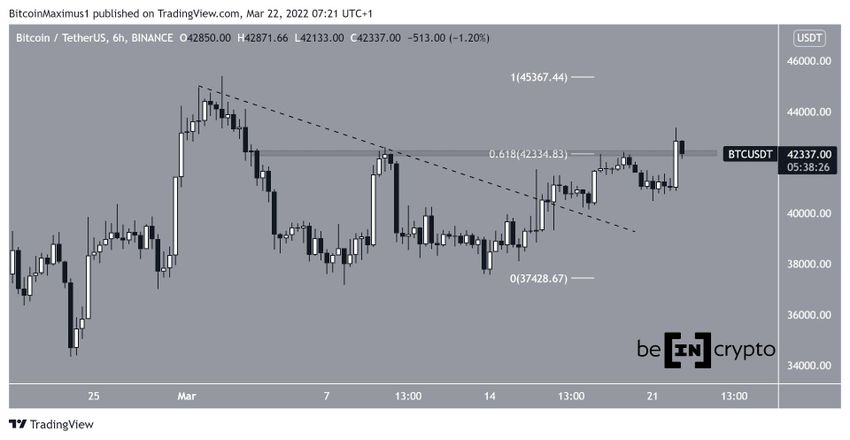 SponsoredAllerdings konnte der Bitcoin Kurs am 22. März 2022 über den Widerstand ansteigen und könnte diesen bald als Unterstützung validieren. Falls das passiert, dann wäre das eine bullische Entwicklung, da das 0.618-Fib-Retracement-Level oftmals ein entscheidendes Widerstandslevel nach einer größeren Abwärtsbewegung ist.