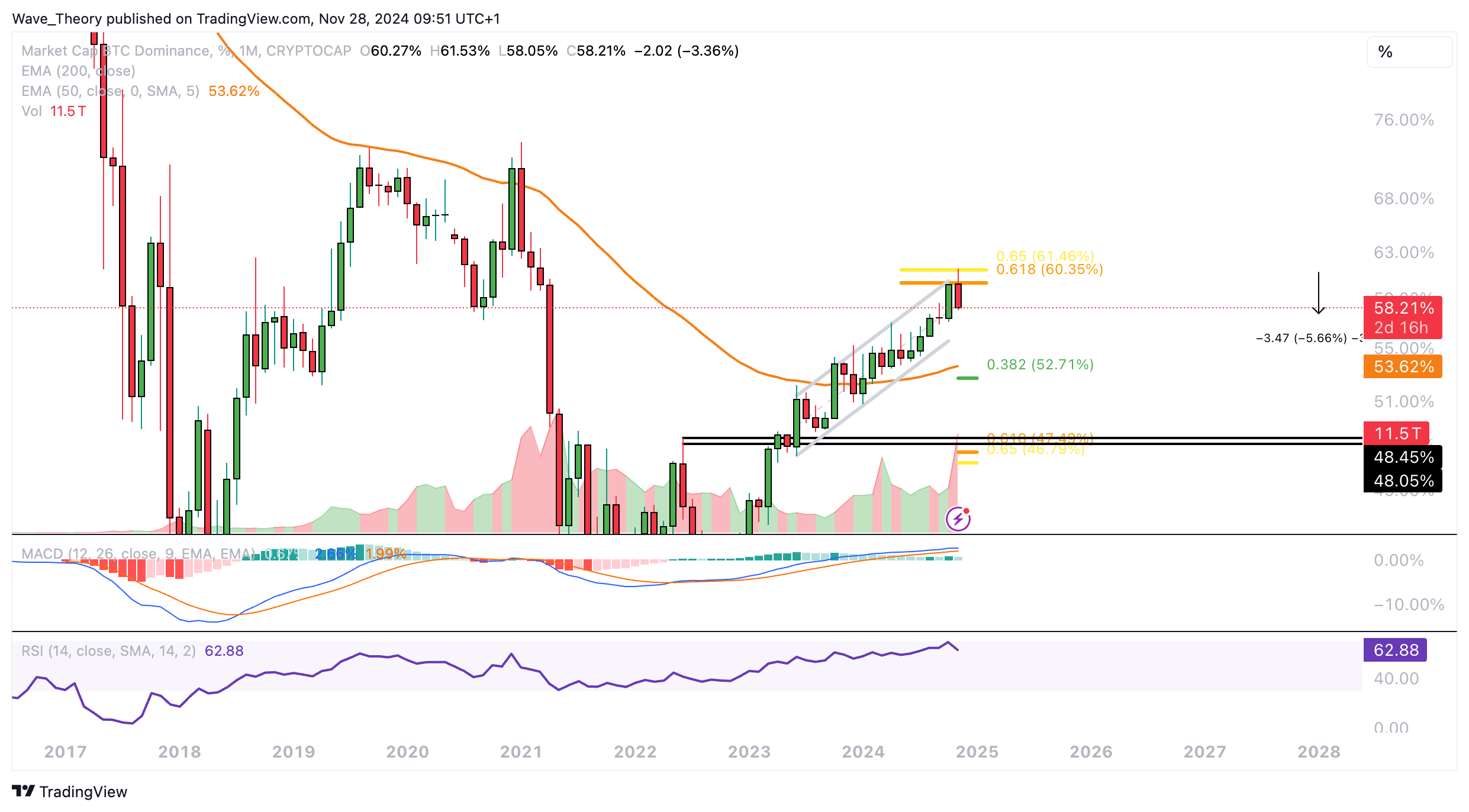 Bitcoin stößt jetzt am Golden Ratio Niveau bei rund 60,5 % auf bärische Ablehnung. Damit wartet am 50-Monate-EMA bei rund 53,62 % die nächste signifikante Unterstützung.
