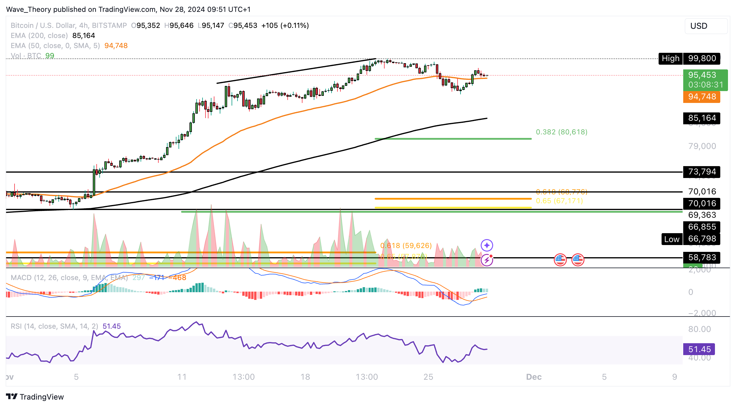 Im 4H-Chart befindet sich der BTC Kurs aktuell am 50-4H-EMA bei rund 94.750 USD. Sollte sich Bitcoin darüber halten, könnte er schon bald die 100.000 USD Marke ansteuern.