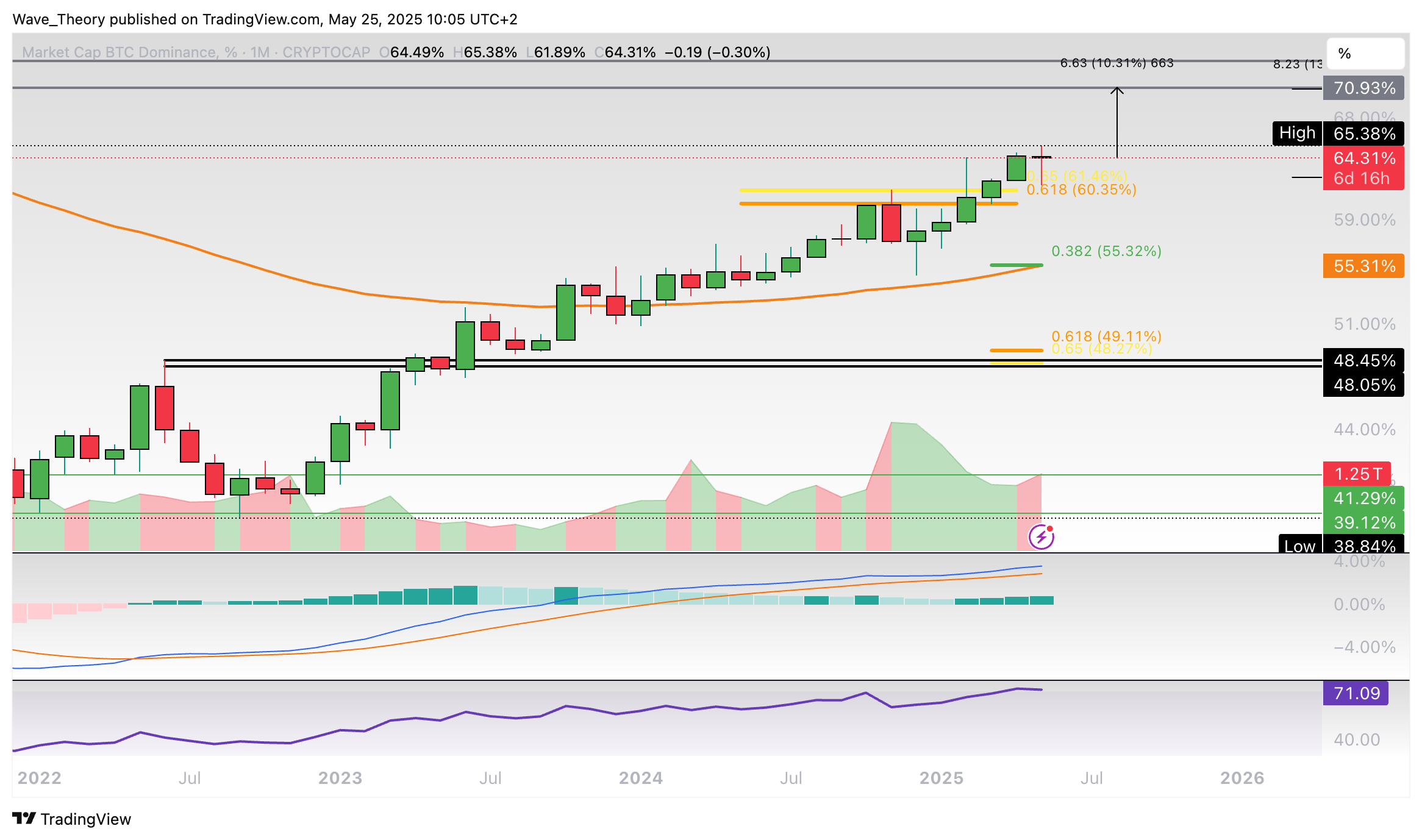 Ansonsten warten spätestens bei rund 55,3 % und bei rund 49 % die nächsten signifikanten Fibonacci Unterstützungen. Nach oben hin wartet zwischen rund 70,9 % und 74 % signifikanter Widerstand.