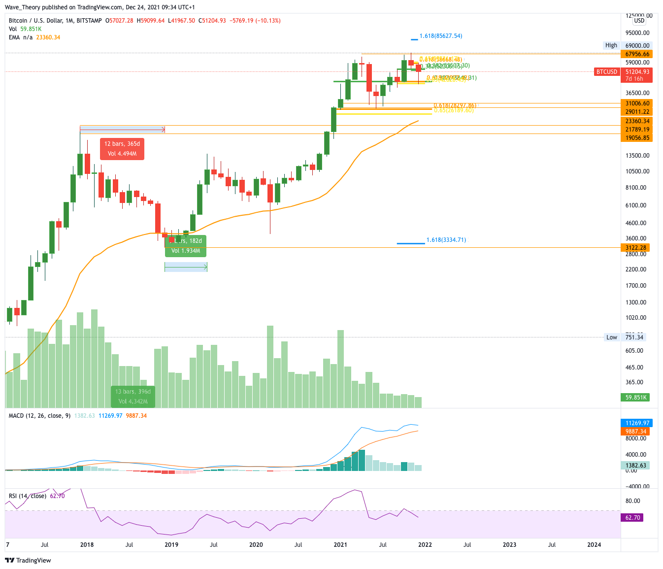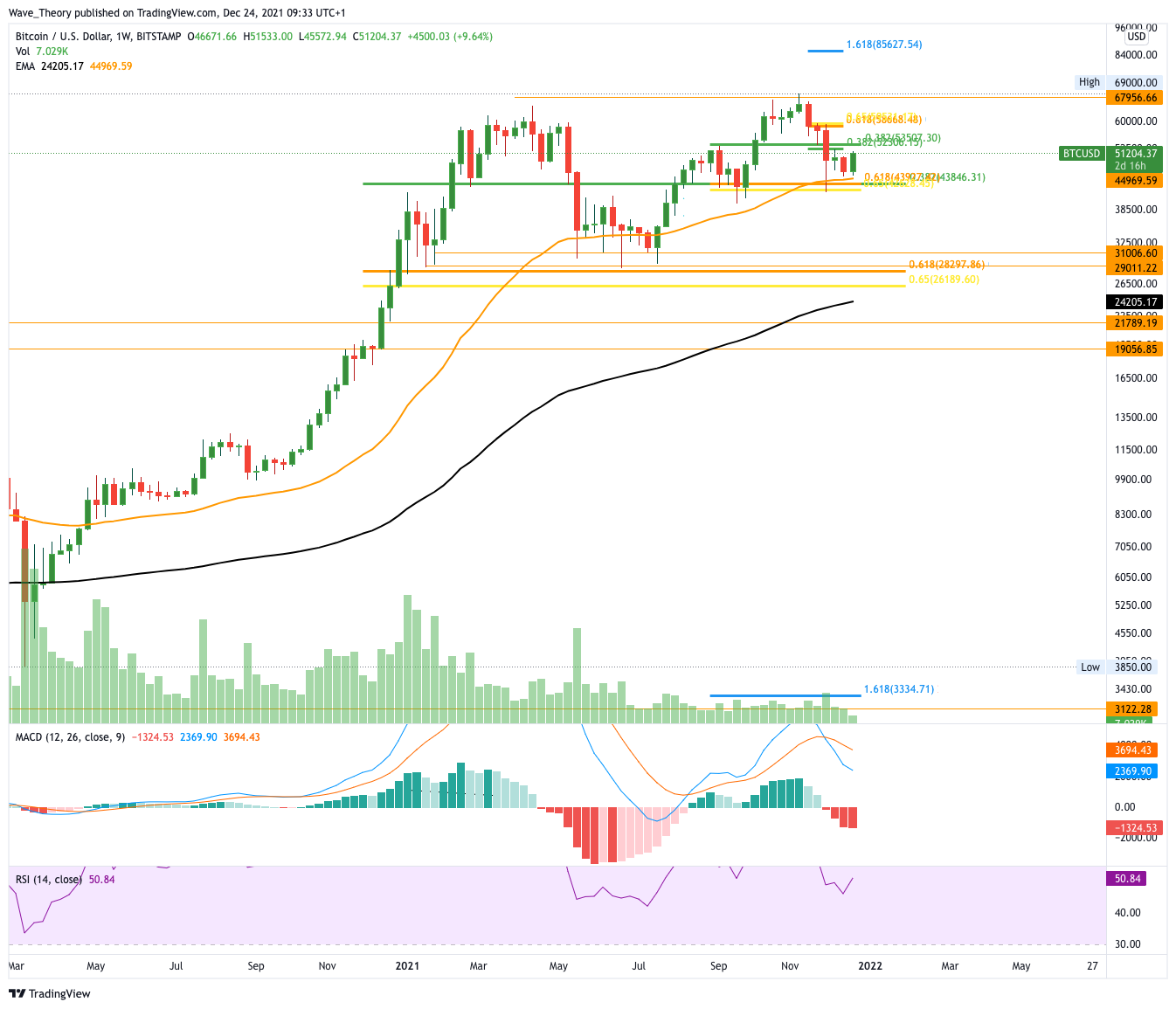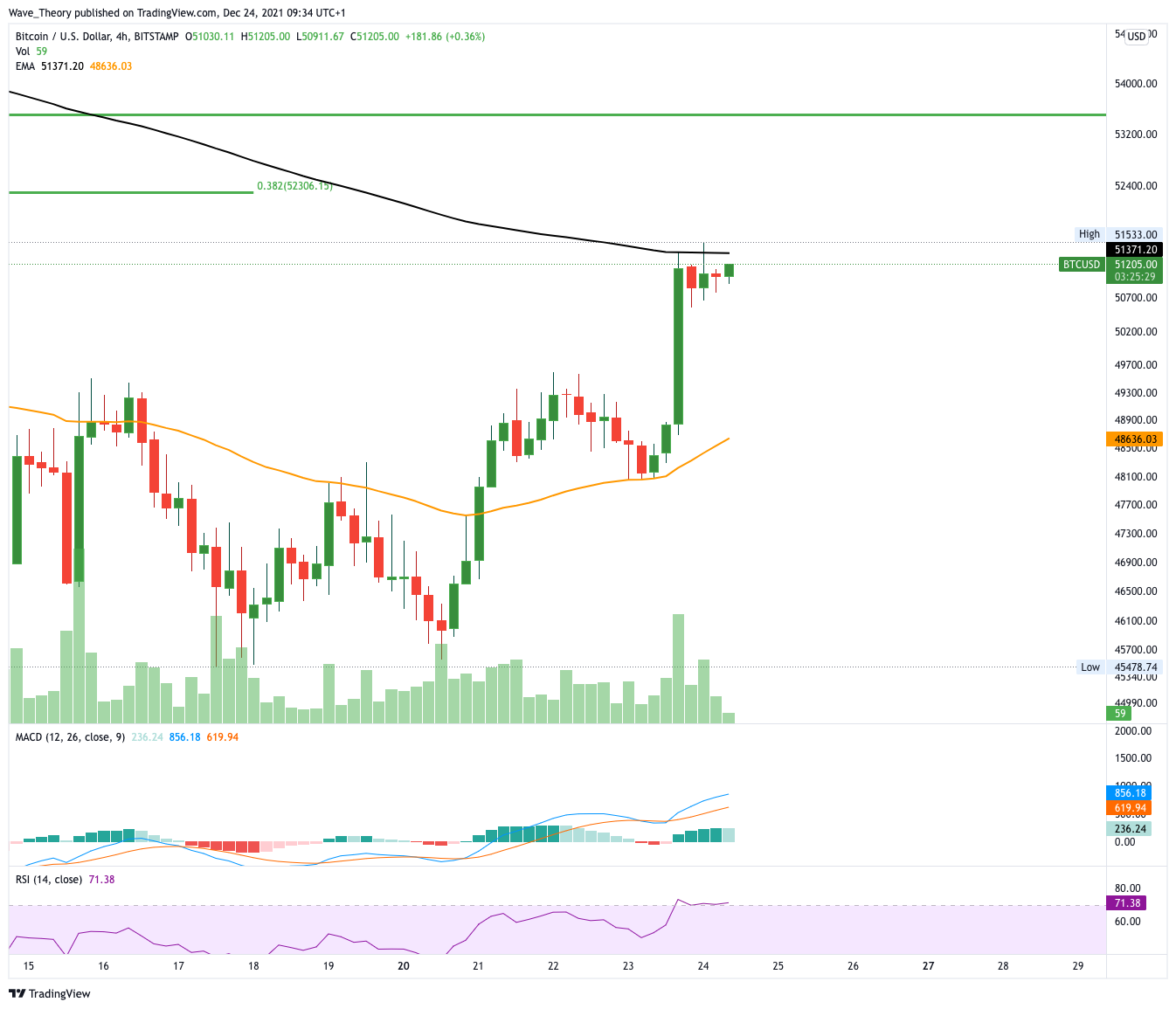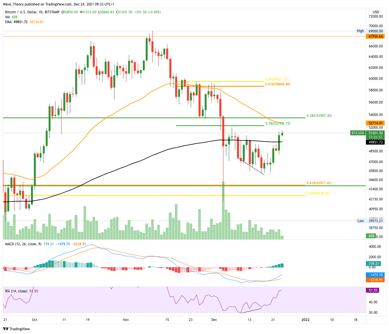 In der letzten Bitcoin Kurs Analyse formte Bitcoin eine massive bullische Divergenz im RSI woraufhin Bitcoin von rund 45.000 USD auf 52.000 USD stieg. Dabei konnte Bitcoin sogar den 200-Tage-EMA hinter sich lassen und stößt jetzt bei 52.000 – 53.000 USD auf einen wichtigen Fibonacci Widerstand. Durch diesen Widerstand verläuft außerdem der 50-Tage-EMA, welcher als zusätzlicher Widerstand fungiert. Insgesamt zeigt sich der Tageskurs aber sehr bullisch. Das Histogramm des MACDs tickt bullisch nach oben während die MACD Linien bullisch überkreuzt sind. Bitcoin hat die Chance auf bullische Weihnachtsfeiertage!