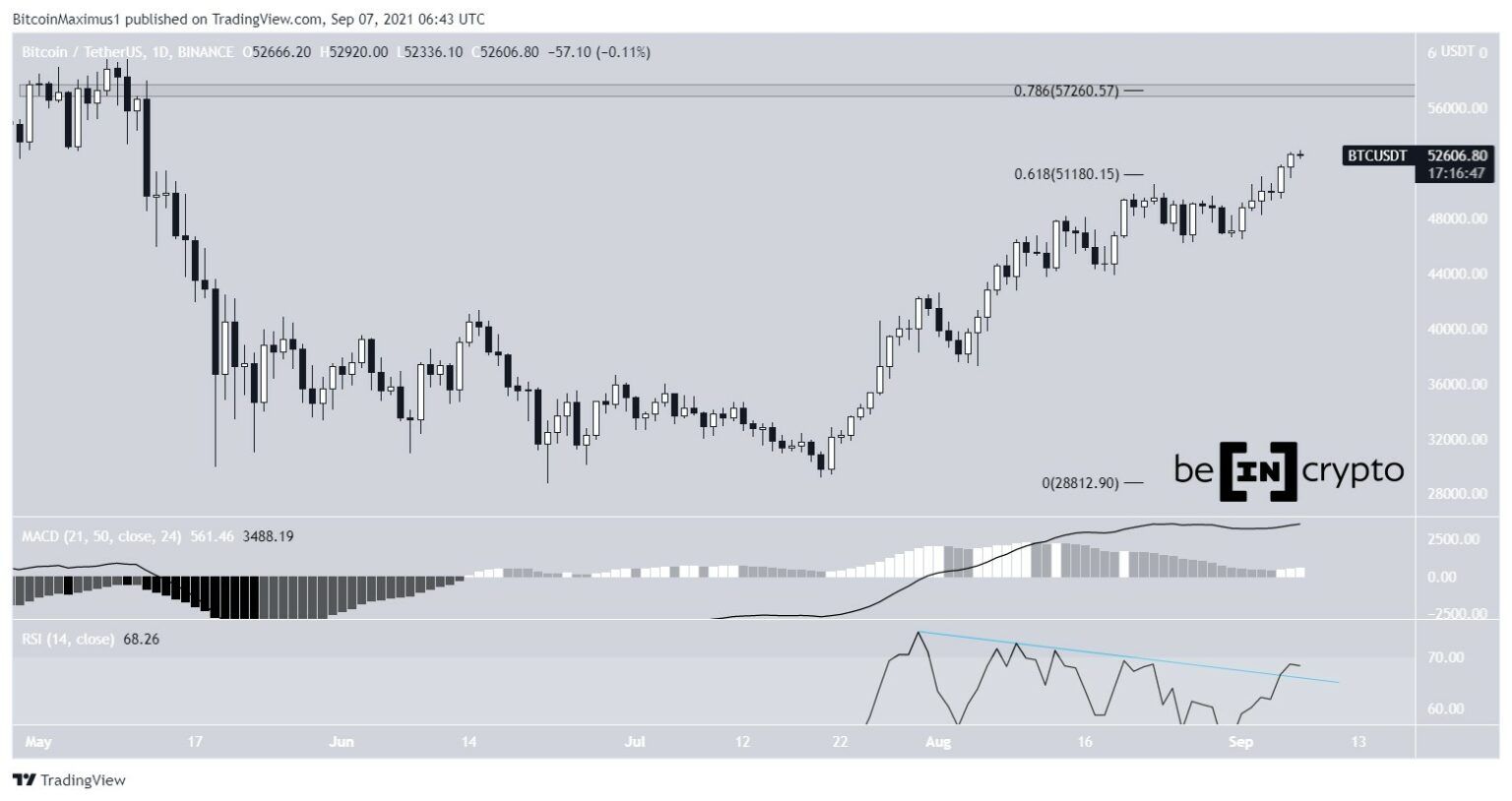 Am 23. August 2021 erreichte der Bitcoin Kurs den Hochpunkt bei 50.500 USD. Allerdings wurde der BTC Kurs dann bei dem 0.618-Fib-Retracement Level abgelehnt. Darum hat die entsprechende Tageskerze die Gestalt einer Shooting-Star-Candlestick. Nachdem der Bitcoin Preis 9 Tage lang konsolidiert war, gab es eine Aufwärtsbewegung und der BTC Preis ist dann am 5. September über den Widerstandsbereich ausgebrochen. Am 7. September 2021 erreichte der Kurs dann den Hochpunkt bei 52.920 USD.