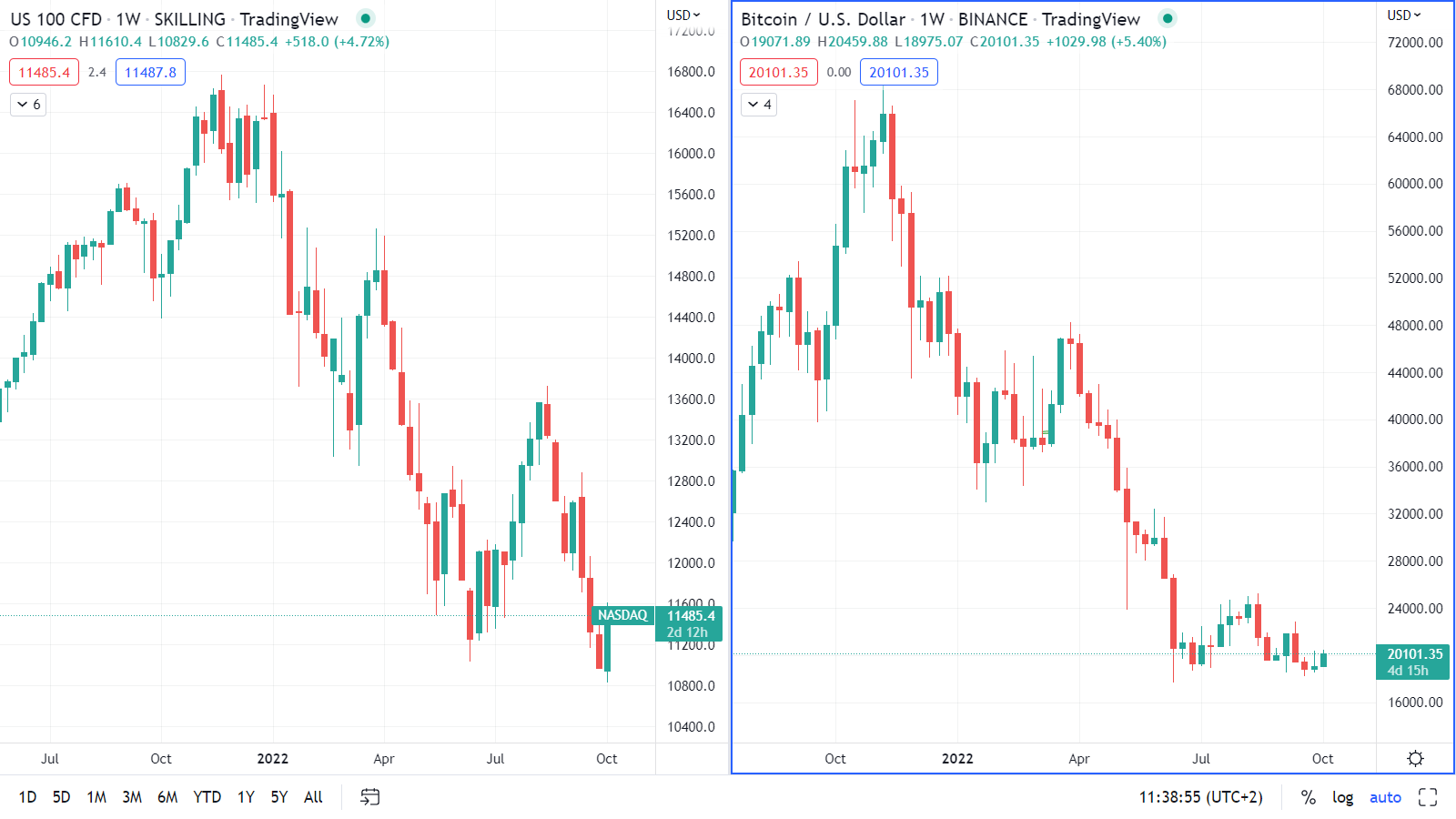 Doch auch bereits seit Anfang 2022 gleichen sich der Bitcoin Kurs und der Nasdaq 100 stark: Man kann die beiden Kurse fast perfekt übereinanderlegen.