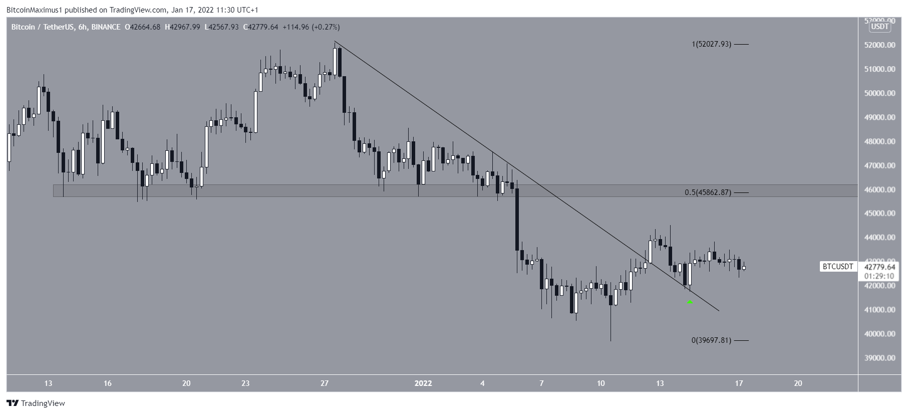 Auf dem 6-Stunden-Chart gibt es ebenfalls einige Anhaltspunkte dafür, dass der BTC Preis erstmal steigen wird. Auf diesem kannst du sehen, dass der BTC Kurs über eine absteigende Widerstandslinie ausgebrochen ist und diese danach als Unterstützung validierte (grüner Pfeil). Wenn so etwas passiert ist, dann steigt der Kurs eines Assets meistens weiter an.