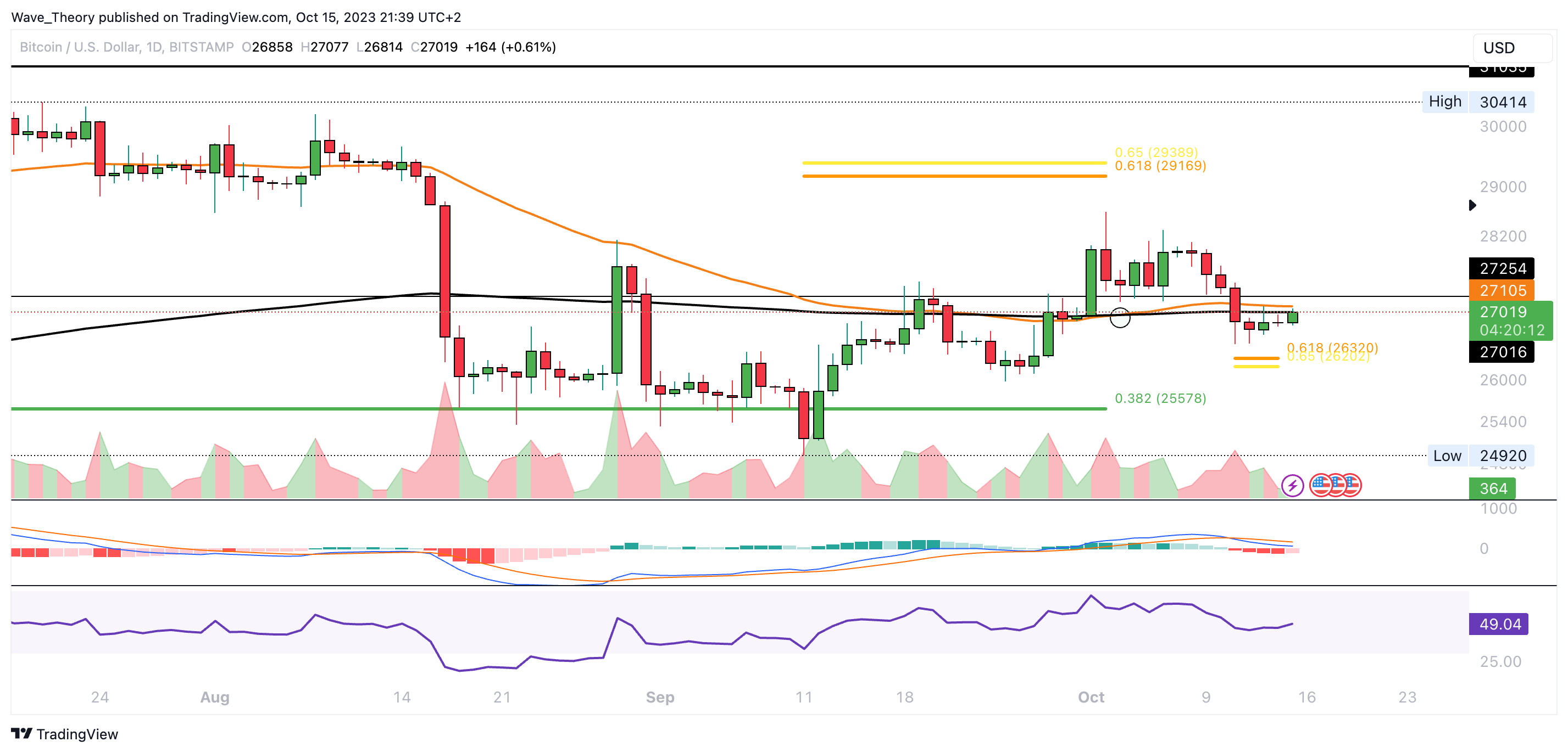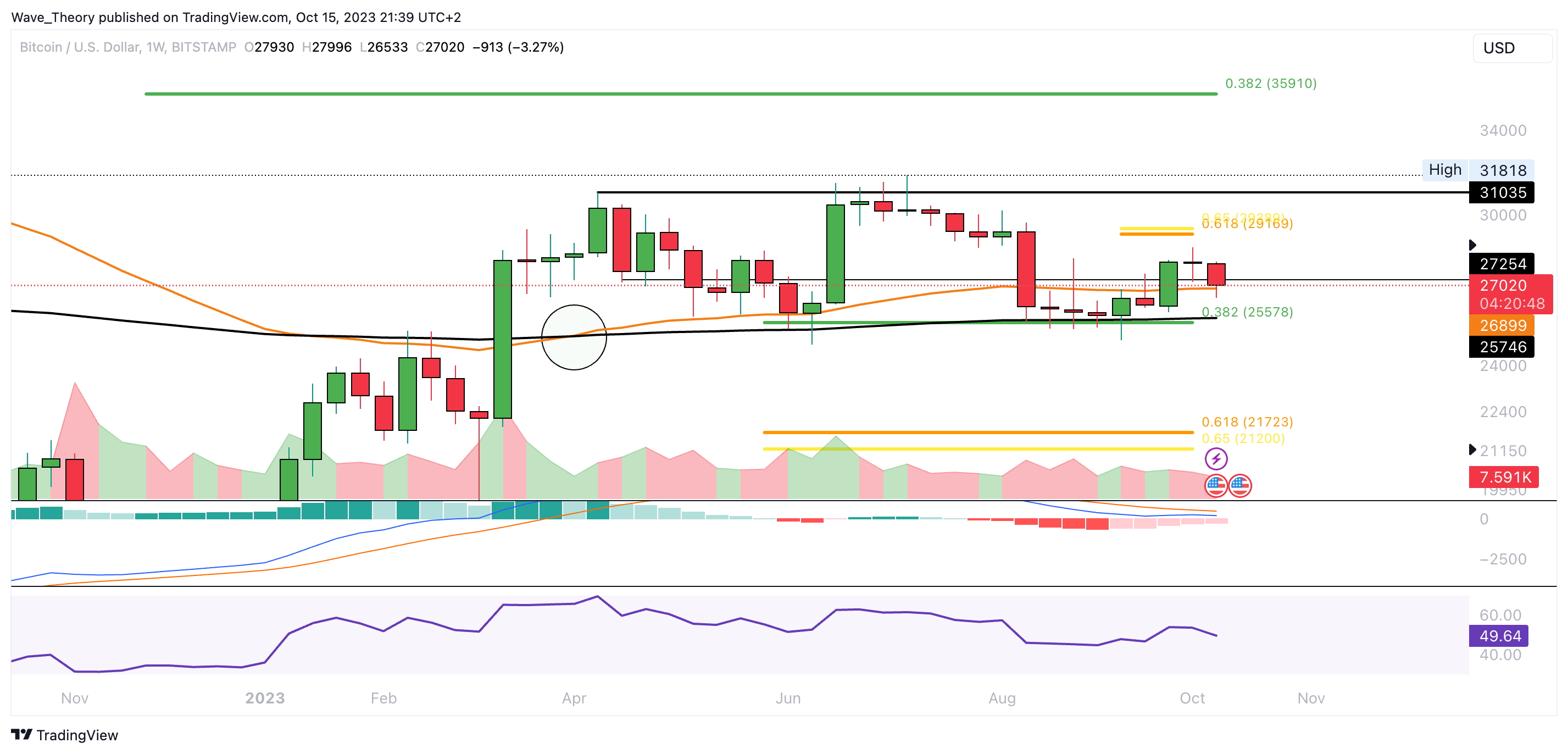 Der RSI zeigt sich dabei neutral und gibt weder bullische noch bärische Signale. Der BTC Kurs stößt jetzt am 50-Wochen-EMA bei rund 26.900 USD kurzfristig Unterstützung.