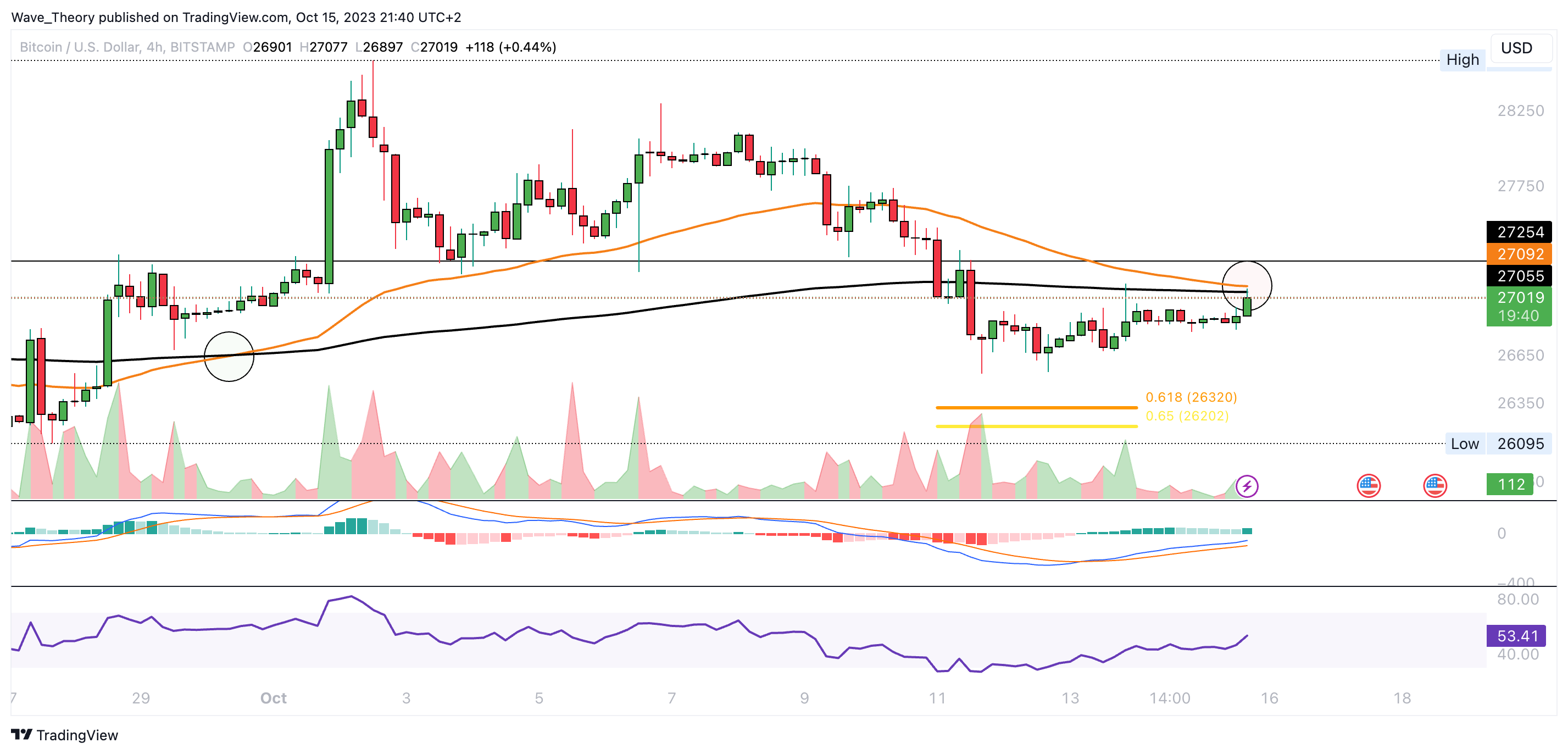 Auch im 4H-Chart könnte das Golden Crossover jetzt durch ein Death Cross ersetzt werden, womit der Trend auch kurzfristig wieder bärisch bestätigt wäre. Jedoch tickt das Histogramm des MACDs aktuell bullisch höher und die MACD Linien sind bullisch überkreuzt.