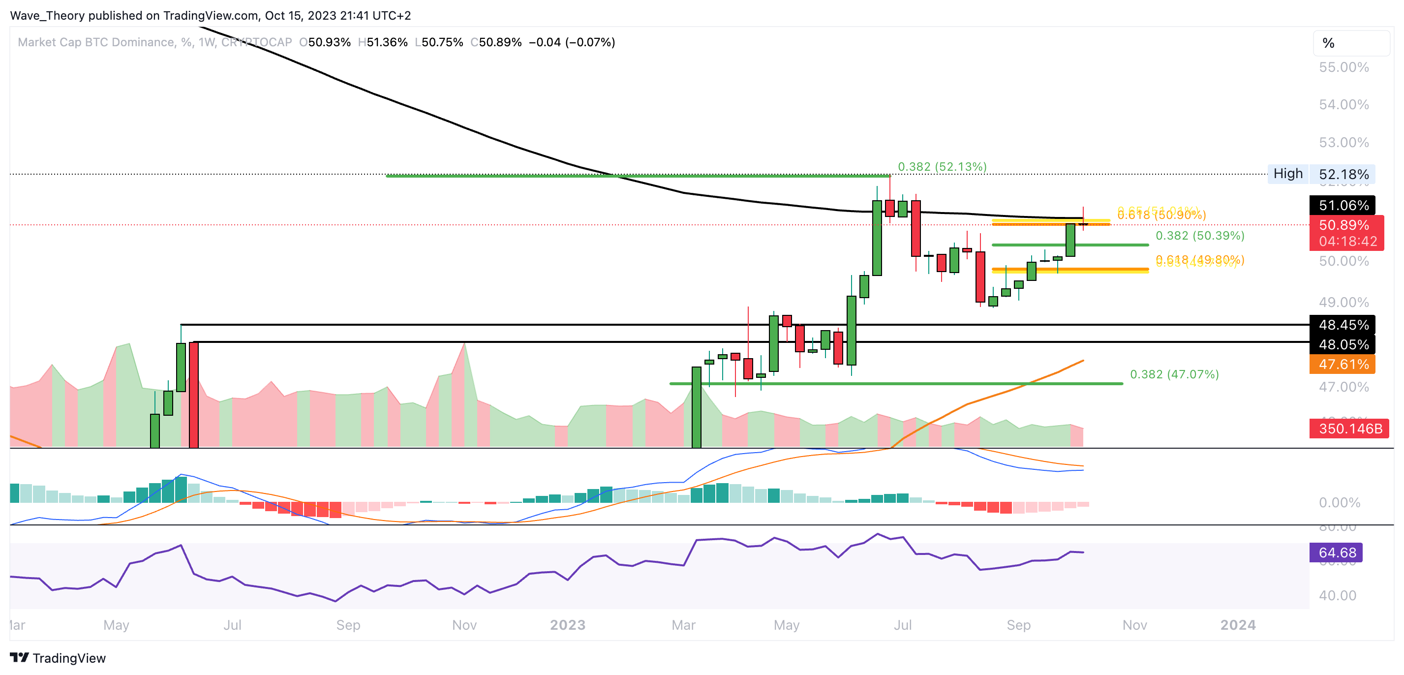 Doch jetzt scheint die Bitcoin Dominanz am Golden Ratio Widerstand am 200-Wochen-EMA bei rund 51 % auf bärische Ablehnung zu stoßen. Damit könnte die Dominanz zu den nächsten Fib Unterstützungen bei rund 50,4 % und 49 % korrigieren.