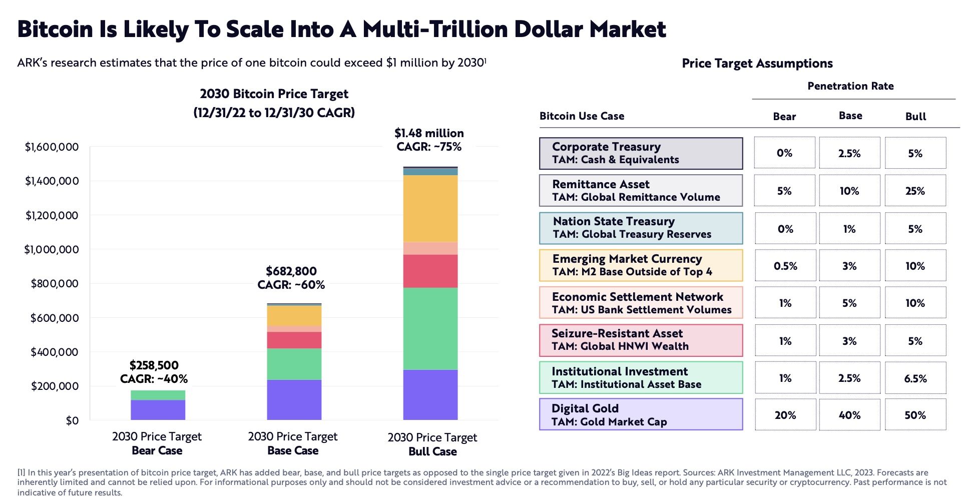 Bezüglich des Preisziels für 2030 gibt es verschiedene Szenarien. Selbst das pessimistischste Szenario, der “Bear Case”, in dem BTC nur als digitales Gold und als Portfolioposition für institutionelle Investoren genutzt wird, hat ein Preisziel von 200.000 USD. Das mittlere Szenario “Base Case” liegt mit deutlich mehr Anwendungsbereichen bei einem Preisziel von rund 680.000 USD. Der “Bull Case” hingegen könnte laut Ark Invest einen Wert von bis zu 1,5 Millionen USD erreichen.