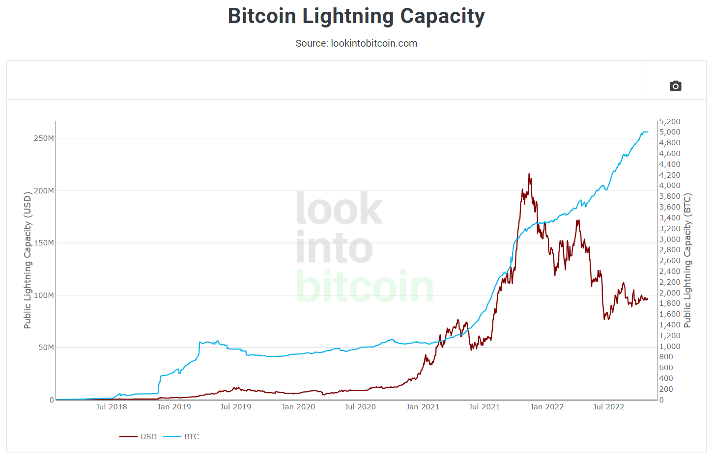 Die Adoption der Layer-2-Lösung “Bitcoin Lightning Network” boomt und verfügt derzeit über rund 88.000 Zahlungskanäle. Mehr als 4.000 Lightning Nodes unterstützen das System. Wie der Graph unten zeigt, steigt die Zahl der Bitcoins im System stetig. Daher dürften wir in eine verheißungsvolle Zukunft für das Bitcoin Lightning Netzwerk blicken.