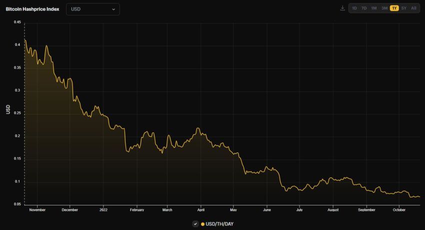 Laut Hashprice Index fiel der Hashpreis (auch als Mining-Profitabilität bekannt) seit Oktober 2021 von 0,412 US-Dollar für ein Terrahash pro Sekunde/Tag auf aktuell 0,068 US-Dollar/THs/Tag